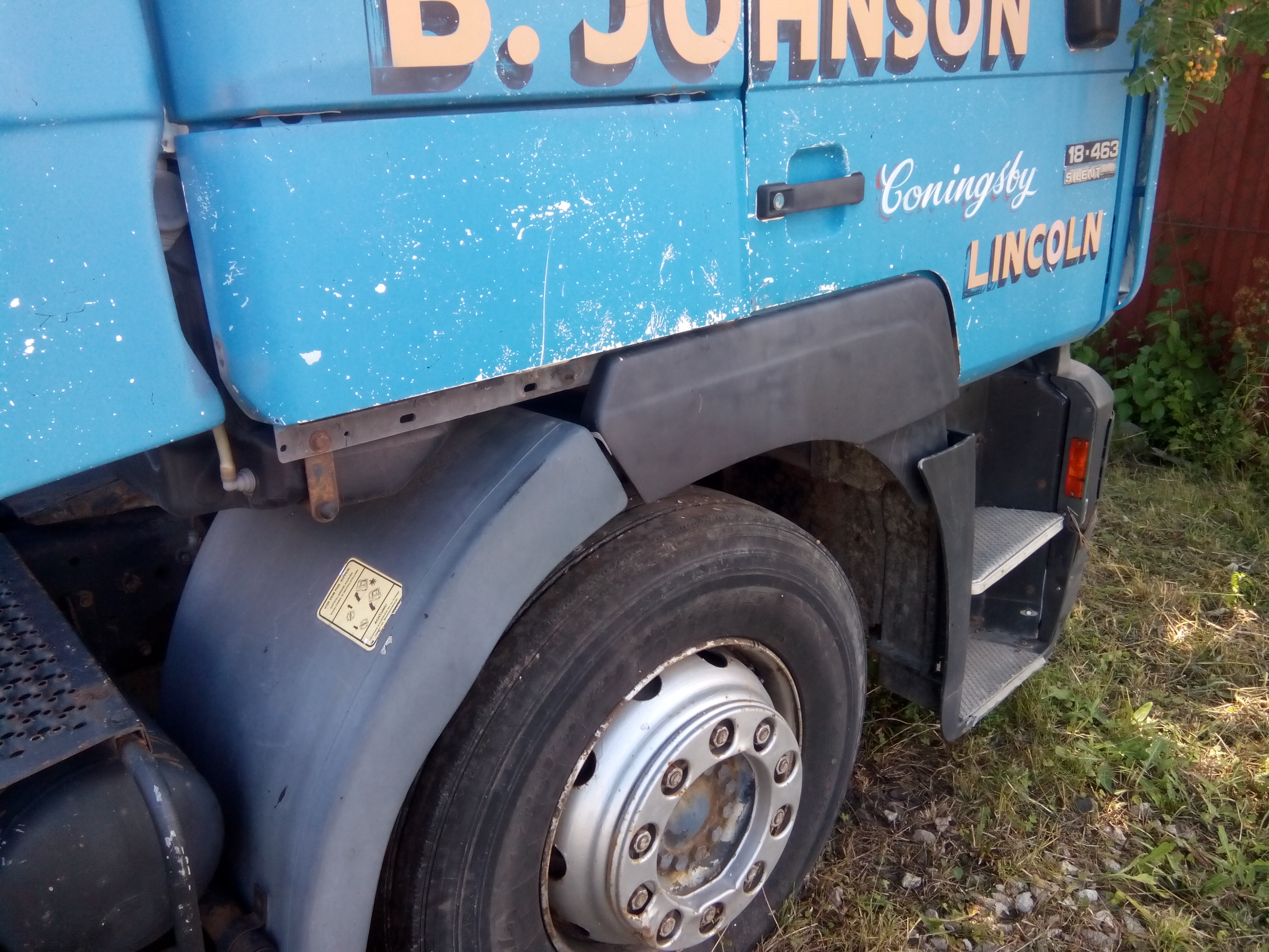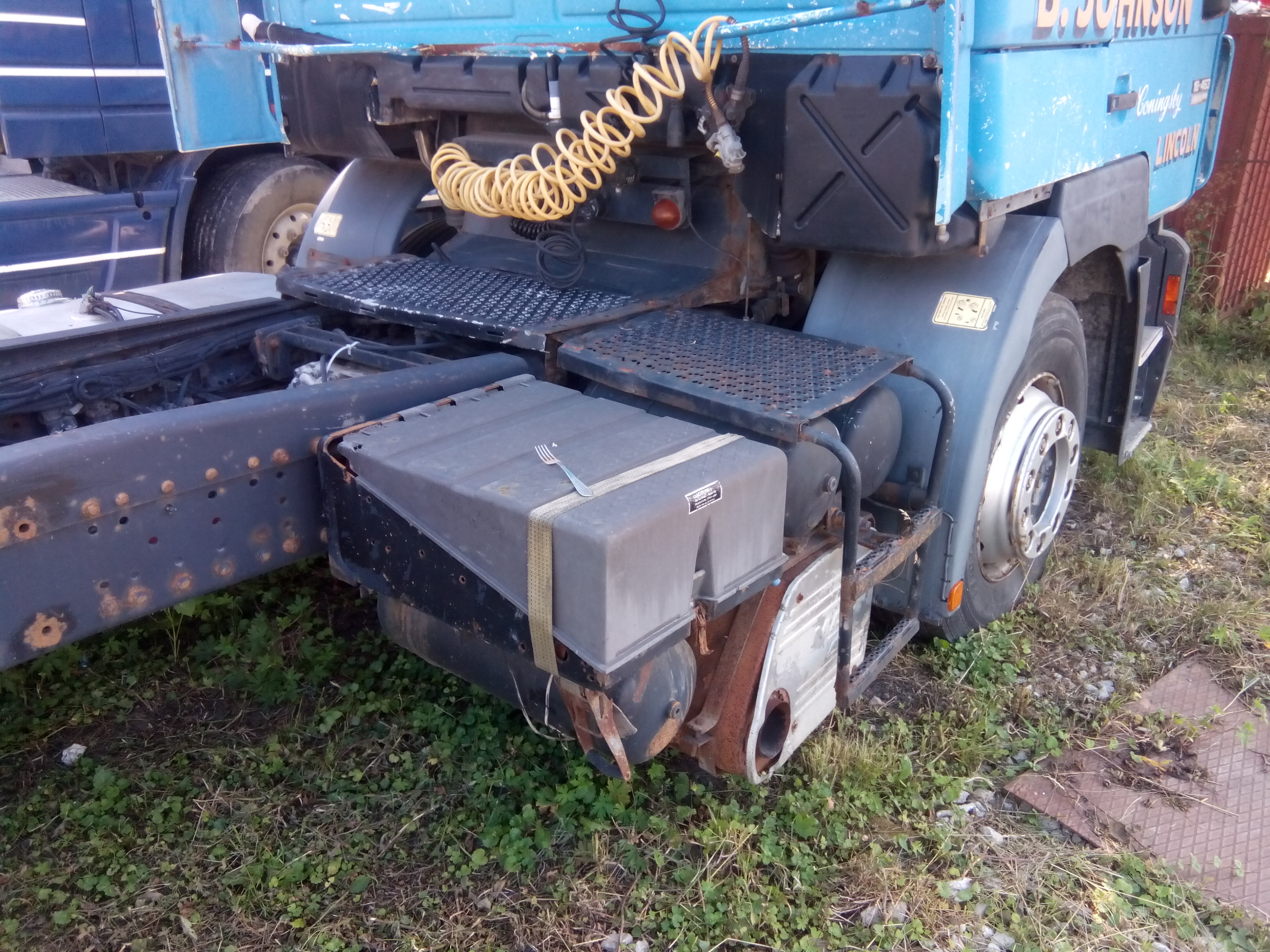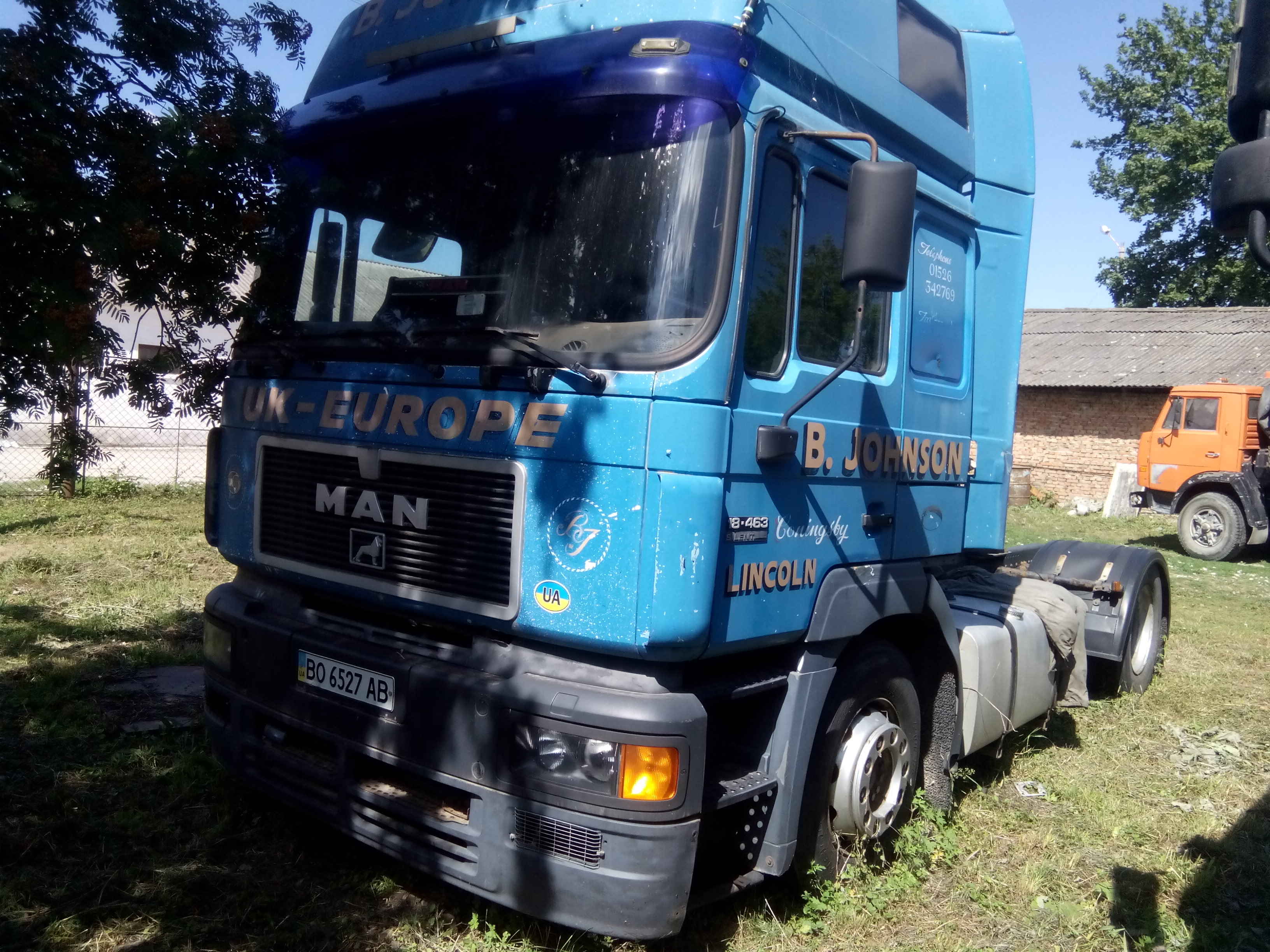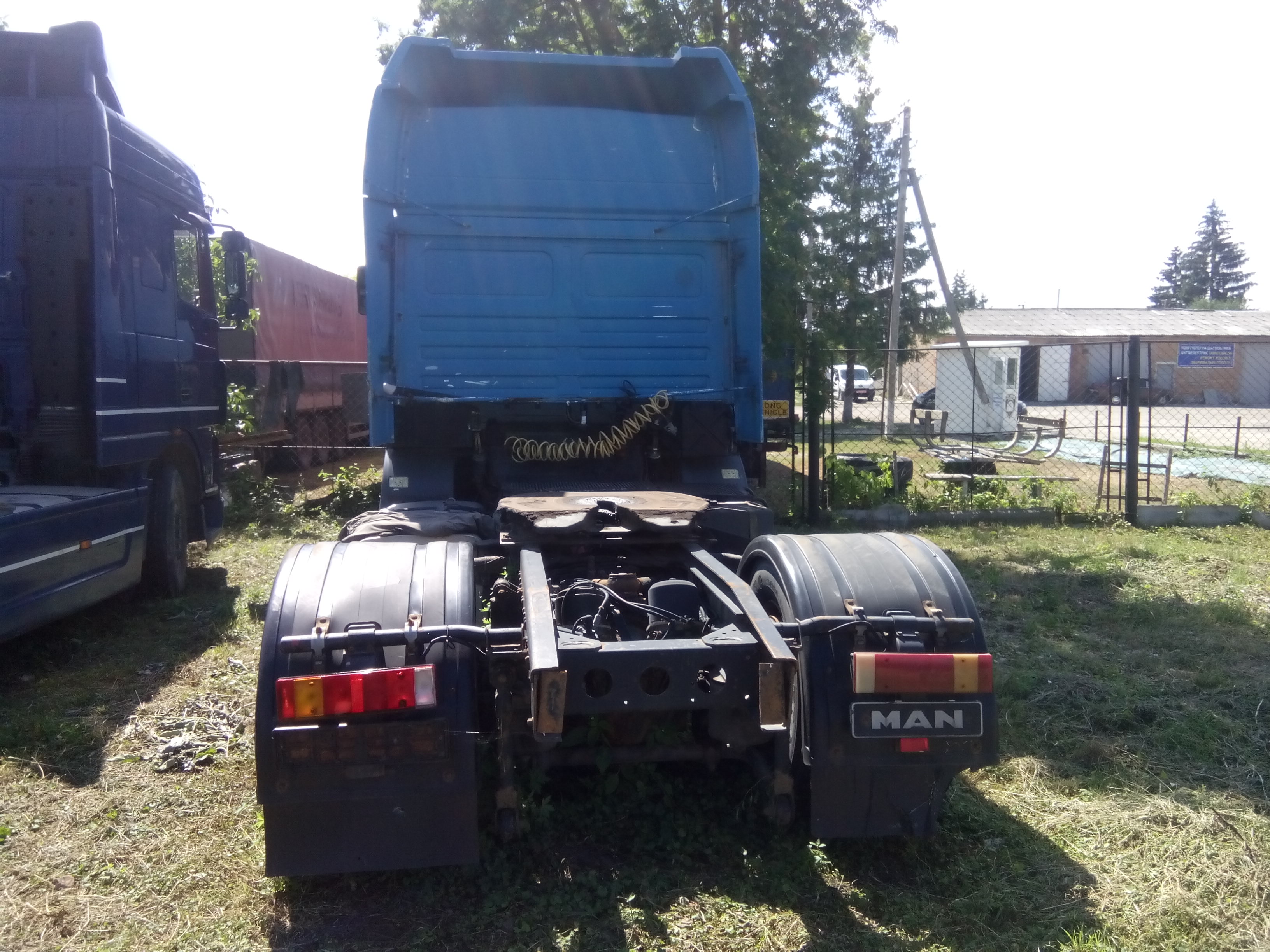 Автомобіль MAN 19.463, ДНЗ ВО6527АВ, №кузова WMAT320Y68M263515 знаходиться у неробочому стані. Колір синій, фарба на кабіні облізла, на лівій дверці вм’ятина, з лівої сторони відсутня ніжка, резина на колесах зношена, на лобовому склі з правої сторони тріщина.