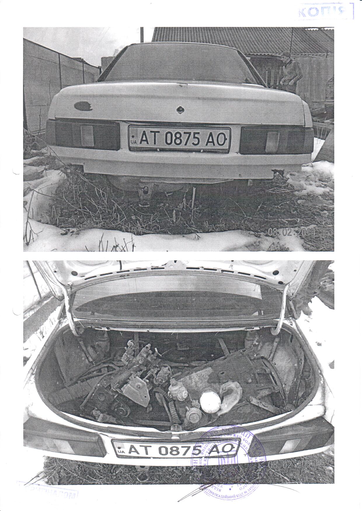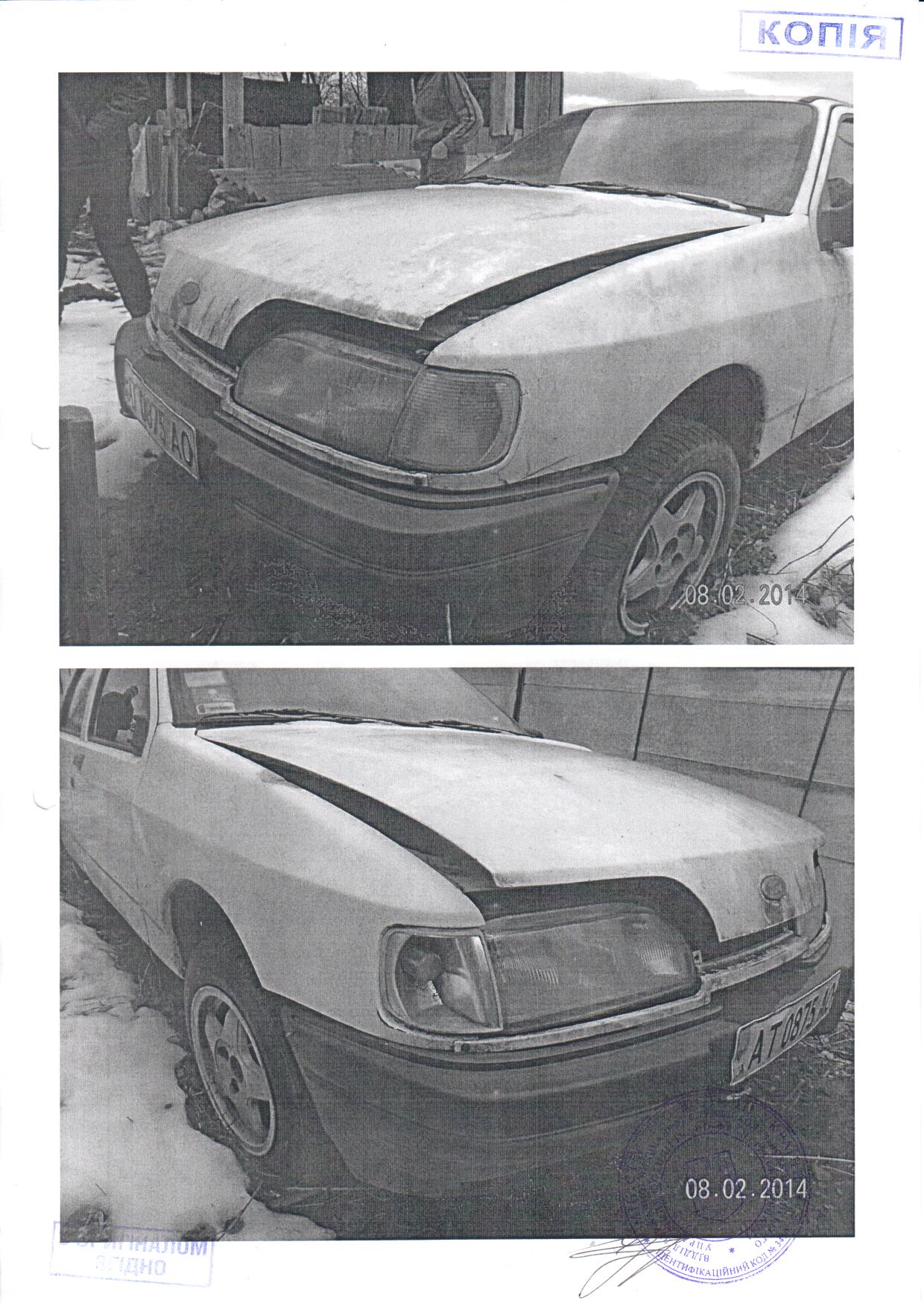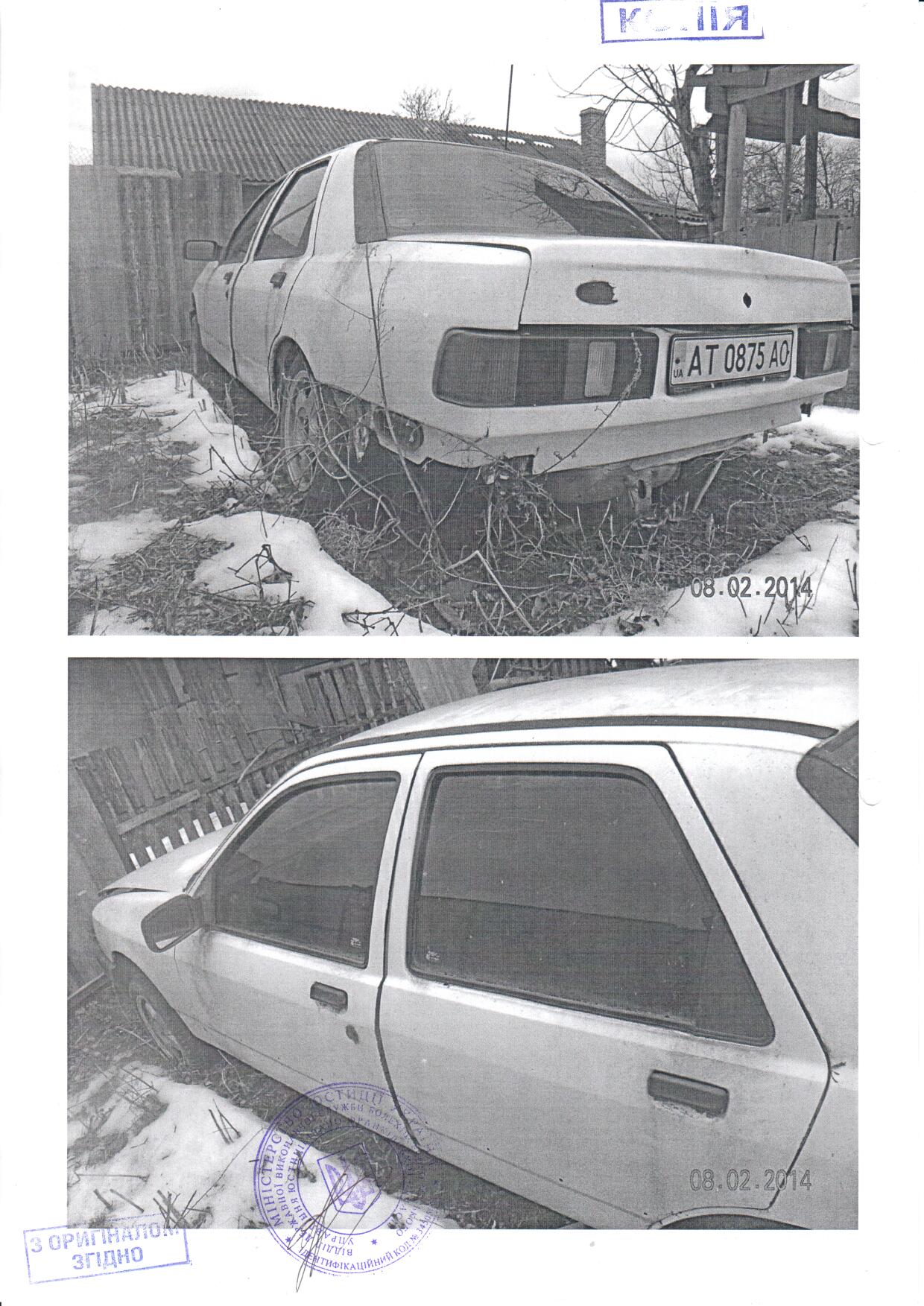 Леуковий седан – В FORDSiera, 1987 р.в., білого кольору, обєм двигуна 1600 см3, бензин, пробіг – 32057 км, тип трансмісії механічний, комплектація базова, ДНЗ АТ 0875 АО, шасі № WF0FXXGBBFHD05562 (Т.З. ЗНАХОДИТЬСЯ У НЕПРИДАТНОМУ ДЛЯ ЕКСПЛУАТАЦІЇ СТАНІ, відсутній задній бампер, та праве дзеркало заднього виду, по всьому кузові наявні вмятини і корозія)