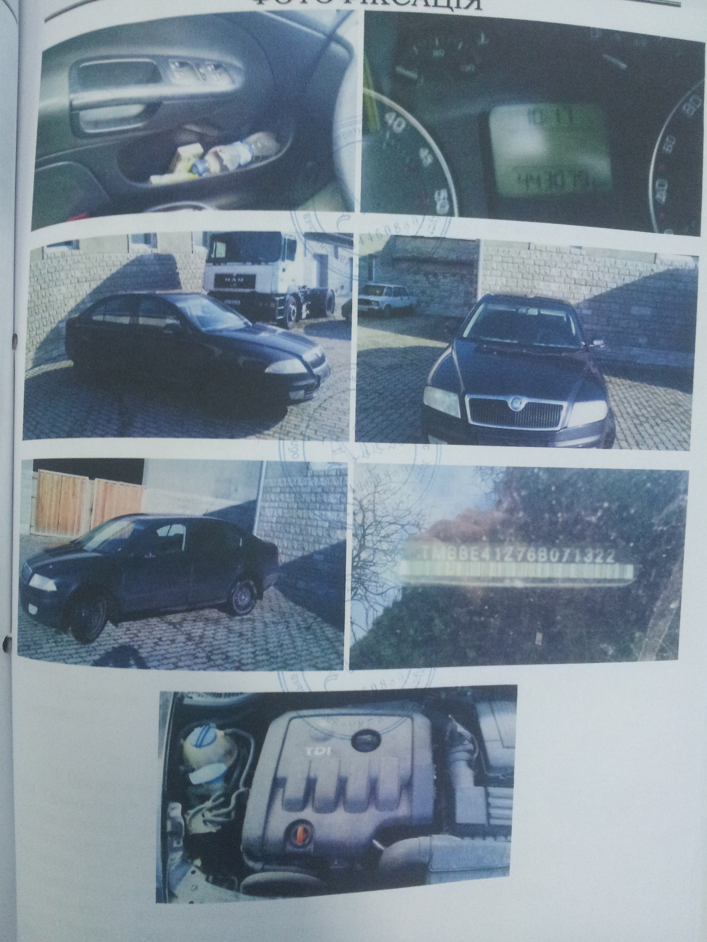 Т/З марки Шкода Октавія А5, 2005 р.в., кузов №TMBBE41Z76BO71322, Чорного кольору, ДНЗ відсутній. Свідоцтво т/з відсутнє. Наявний 1 ключ замку запалювання, запасне колесо. Наявна тріщина заднього бамперу та лівого дзеркала; наявні численні подряпини по всьому периметру кузова. Салон забруднений.