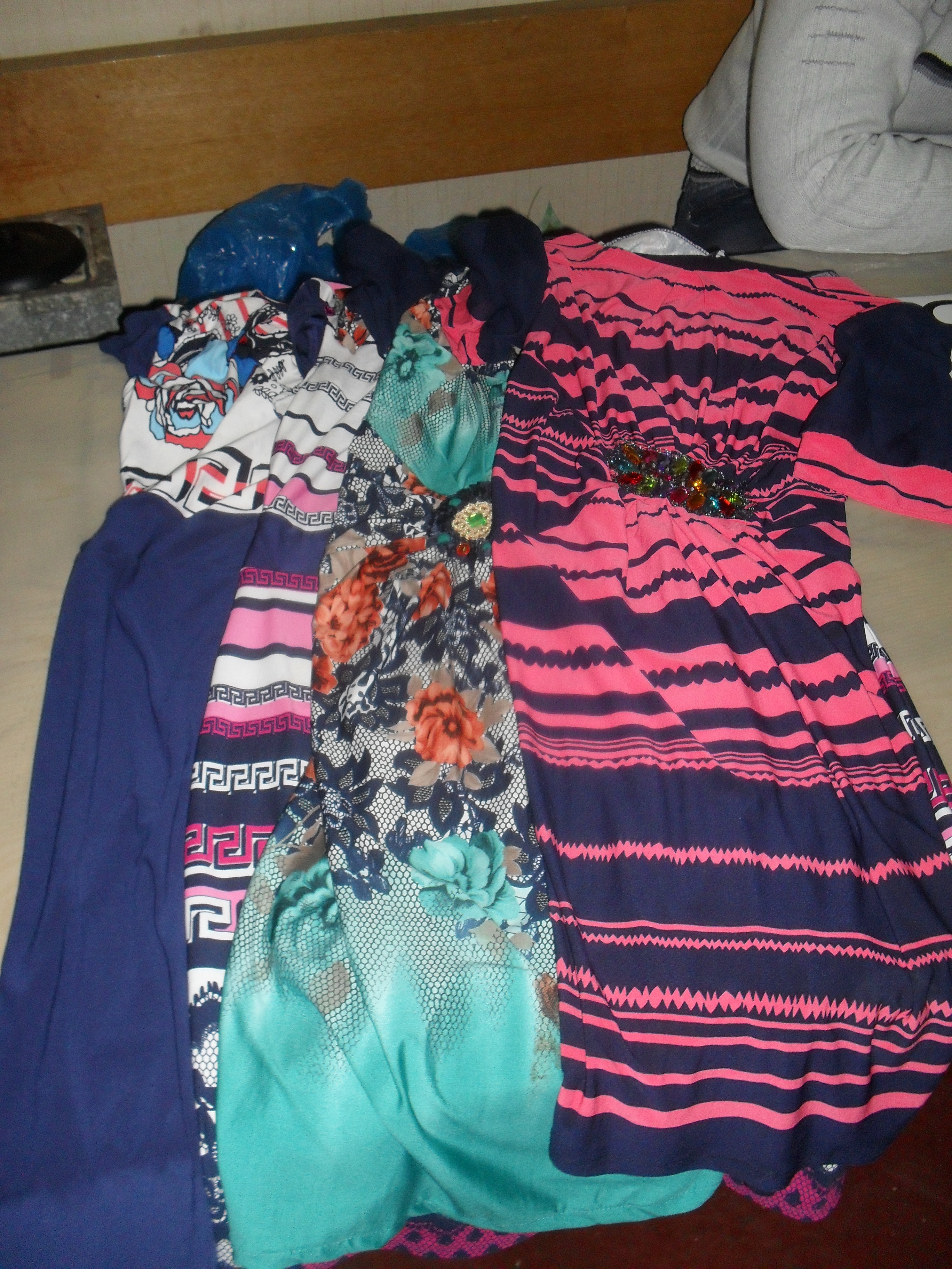 Сукні жіночі в асортименті, 5 шт.: різнокольорові, різні розміри і фасони, 4 шт.; темно-синій колір, з шифоновими рукавам, розмір 50, 1 шт.