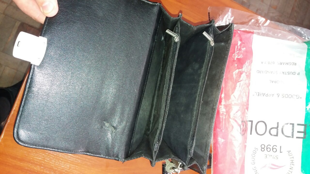 Чорного кольору, з лівої сторони ручка пришита ниткою.