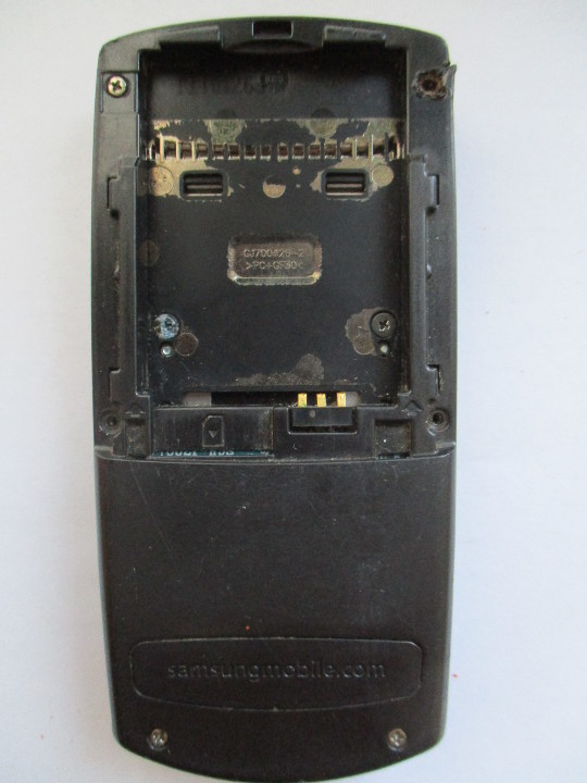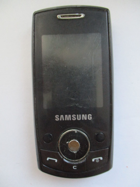 Мобільний телефон Samsung, Imei пошкоджено, чорного кольору, б/в, наявні пошкодження екрану телефону, кришка акумуляторної батареї та акумуляторна батарея відсутні.