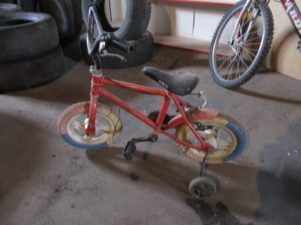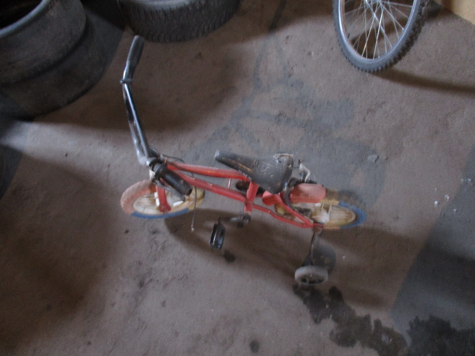 Дитячий велосипед чотирьохколісний , червоного кольору, одне колесо відсутнє,ланцюг від велосипеда відсутній, б/к