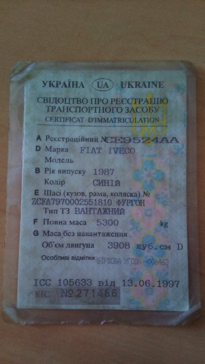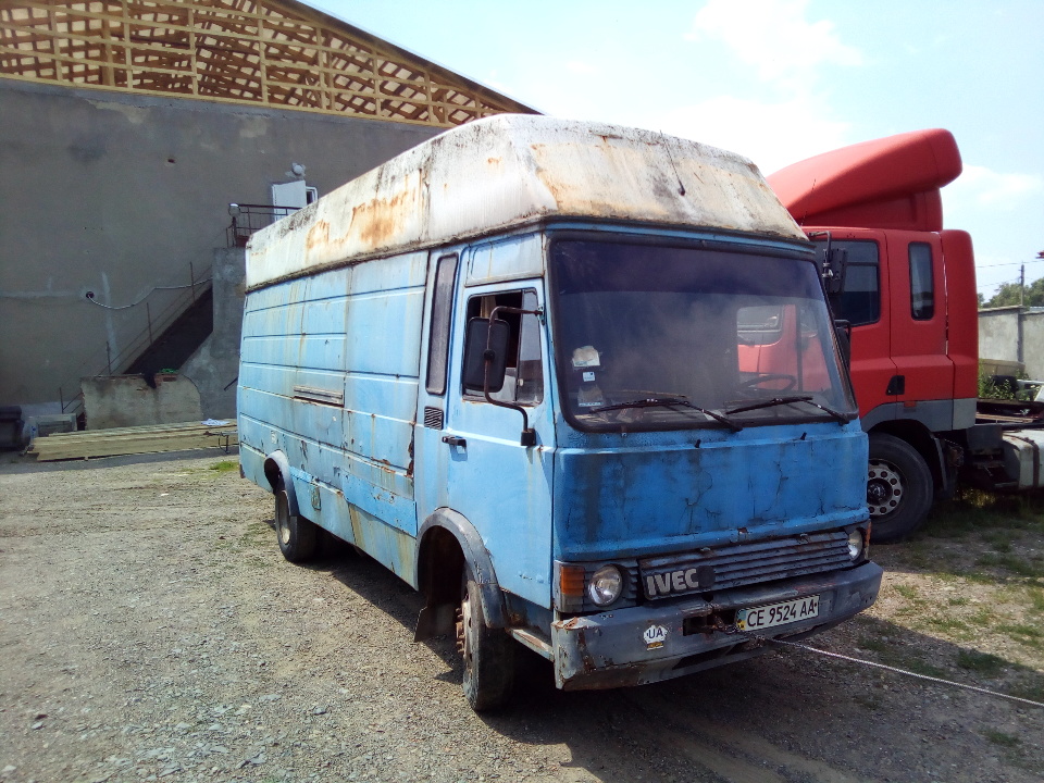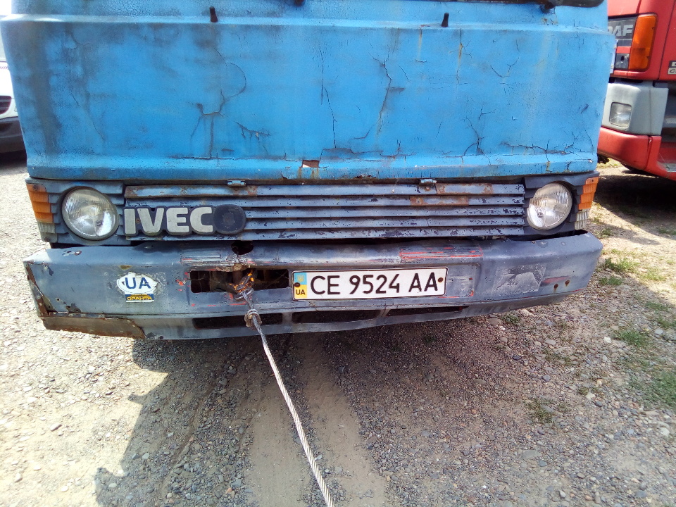 КТЗ - автомобіль марки засіб FIAT IVECO, 1987 р.в., синього кольору, ДНЗ СЕ9524АА, тип фургона вантажний, об'єм двигуна 3908 см, повна маса - 5300 кг, Недоліки: дрібні вм'ятини по всі поверхні кузова, вся поверхня кузова вражена корозією, кузов прогнивший, обірвана петля задніх дверей, розбите скло ліхтарів задніх стопів, по всьому лако-фарбованому покриттю наявні подряпини та відлущення фарби, салон у забрудненому та потертому стані, на двигуні наявні сліди підтікання мастила. КТЗ не на ходу: потрібна заміна або капітальний ремонт деталей, вузлів, агрегатів. В наявності свідоцтво про реєстраціє транспортного засобу, ключ запалення відсутній.