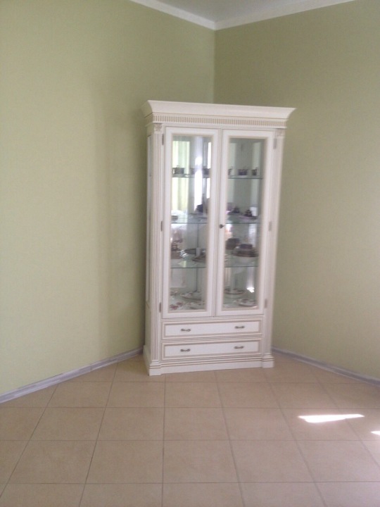 Сервант світло-молочного кольору з ручками золотистого кольору та скляними вітринами.