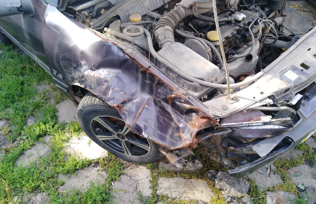 Пошкоджено ЛФП по всій поверхні, на лобовому склі потертості та пошкодження, є сліди відновлювального ремонту, подряпини переднього та заднього бамперів, переднє праве крило та капот пошкоджені в наслідок ДТП, оббивка салону в незадовільному стані. АКБ відсутня.