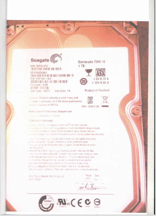 Жорсткий диск марки "Seagate" - Barrakuda 7200.12, 1TB, s/n: 9VPDL1PD, ST31000524AS, P/N 9YP154-304, firmware JC4B, Date code 12073, site code TK, без кабель-продовжувача до нього;