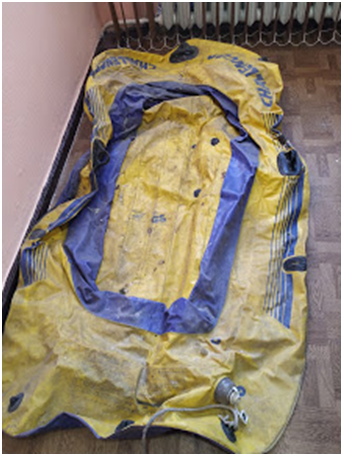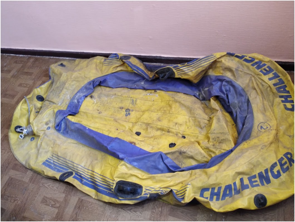 Гумовий човен, синьо - жовтого кольору, має латки та подряпини, був у використанні.