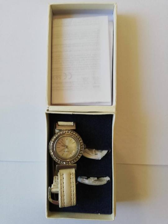 Годинник жіночій в металевому корпусі круглої форми, оздоблений камінцями на білому ремінці "QUARTZ" в робочому стані, б/в.