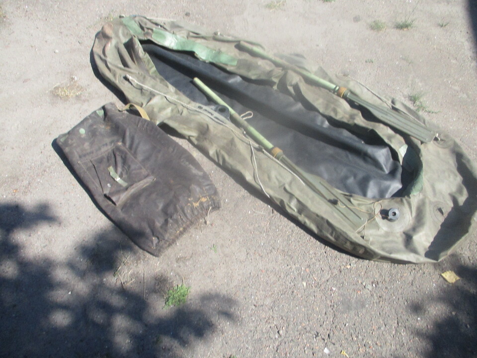 Гумовий човен, сіро-зеленого кольору, в комплекті з двома веслами та чохлом.