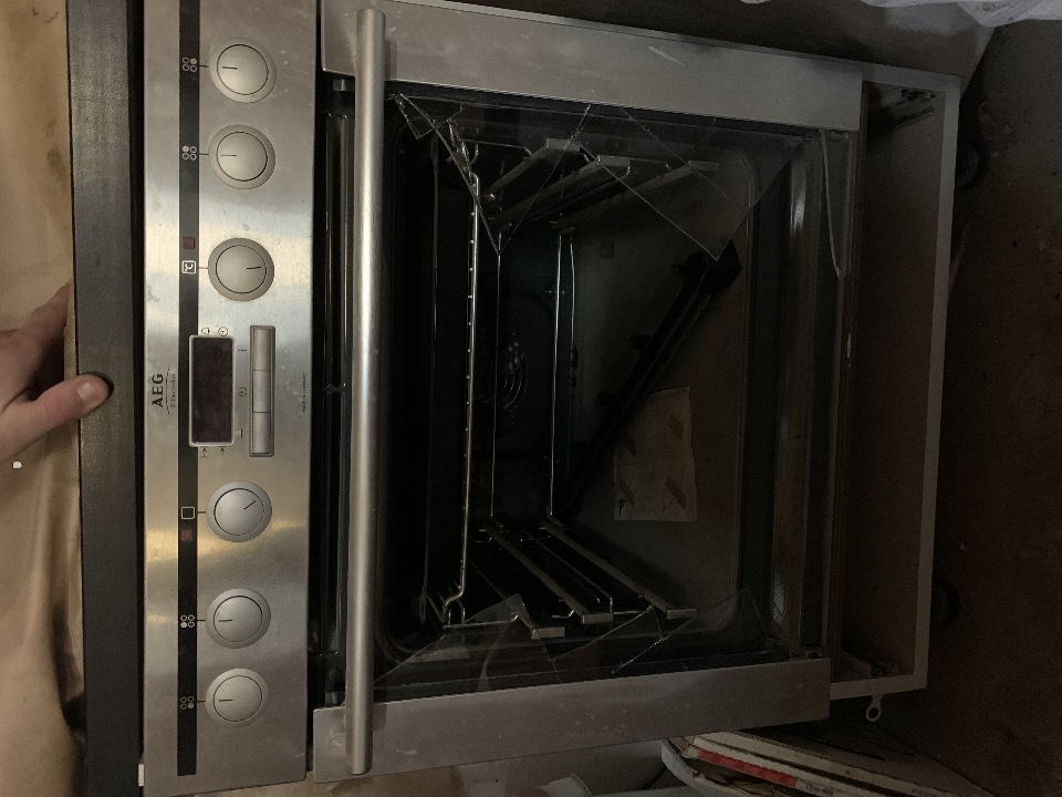 Духова шафа, сірого кольору, з розбитим склом та дверцятами, бувша у використанні, робочий стан не перевірявся.