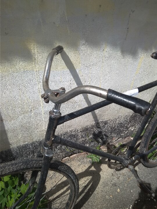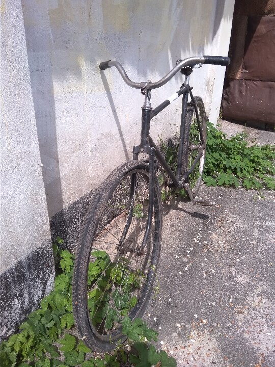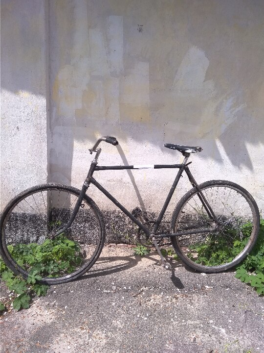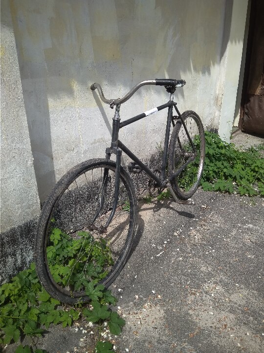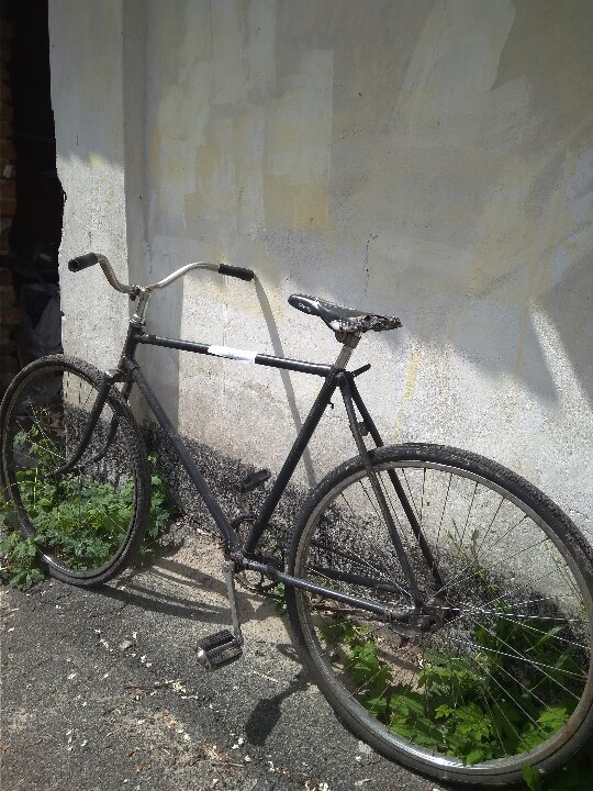 Велосипед з чоловічою рамою. Колір - чорний. Бувший у використанні, колеса зі спущеною гумою, по всій рамі велосипеда злущена фарба. Загальний стан задовільний.