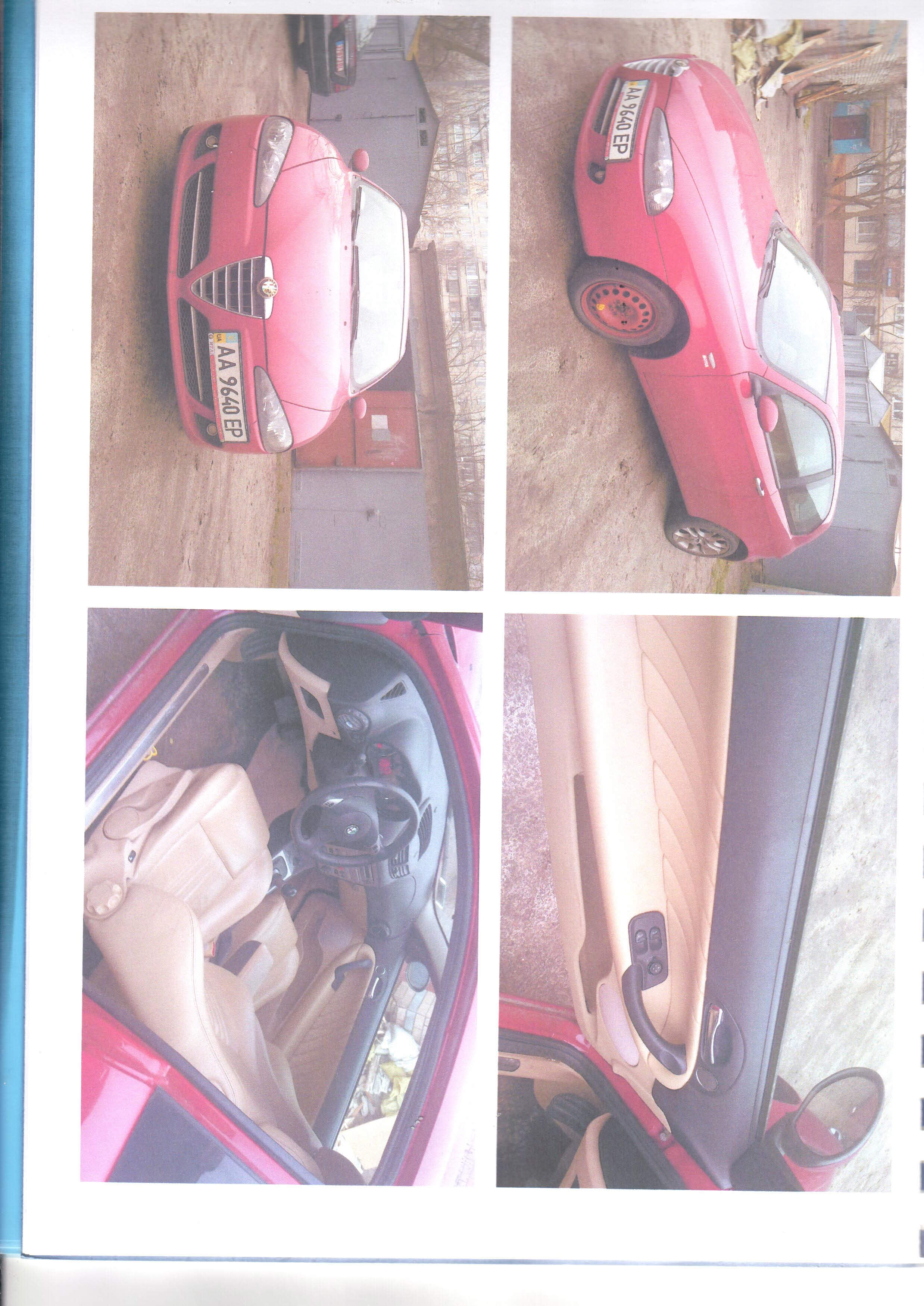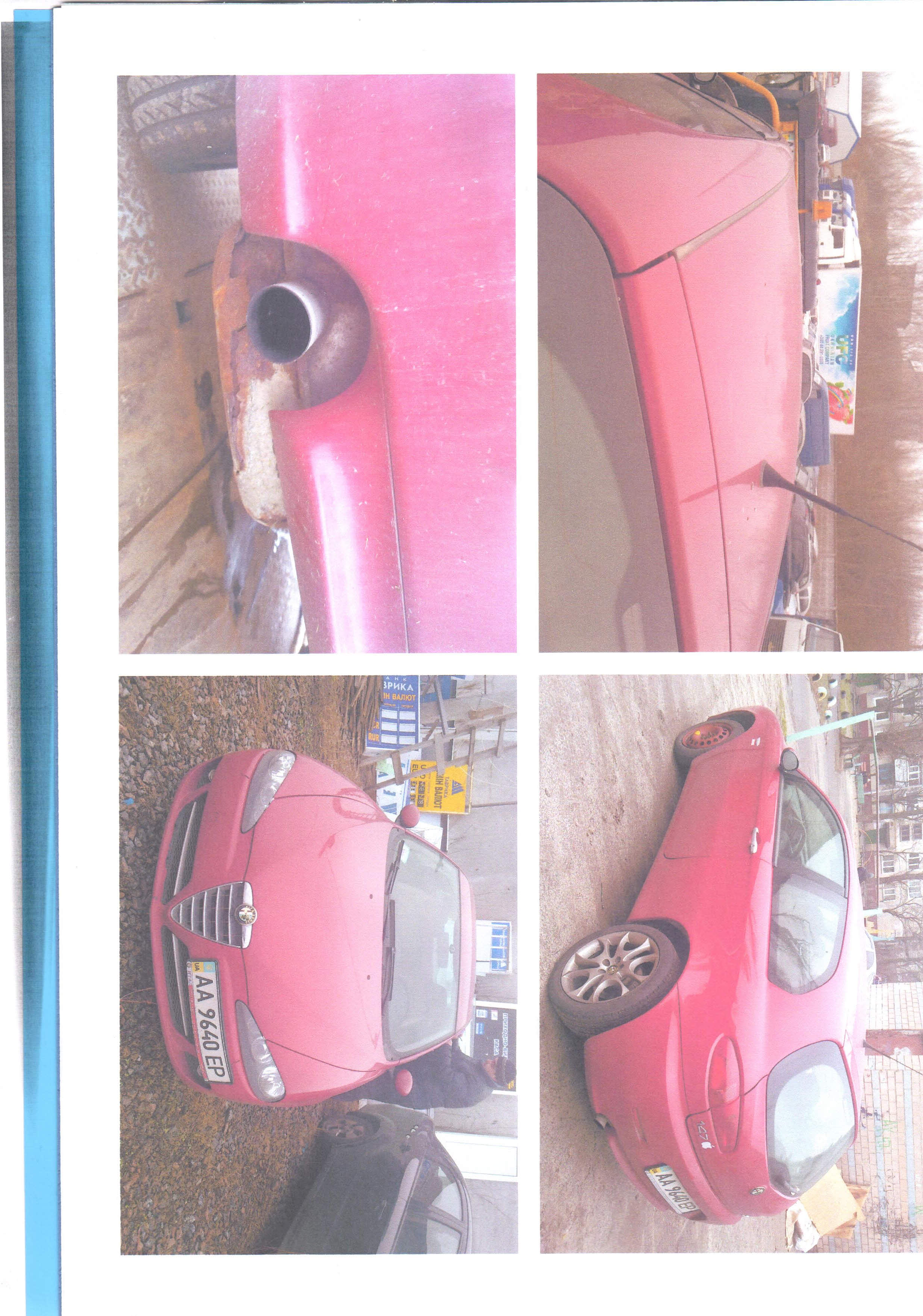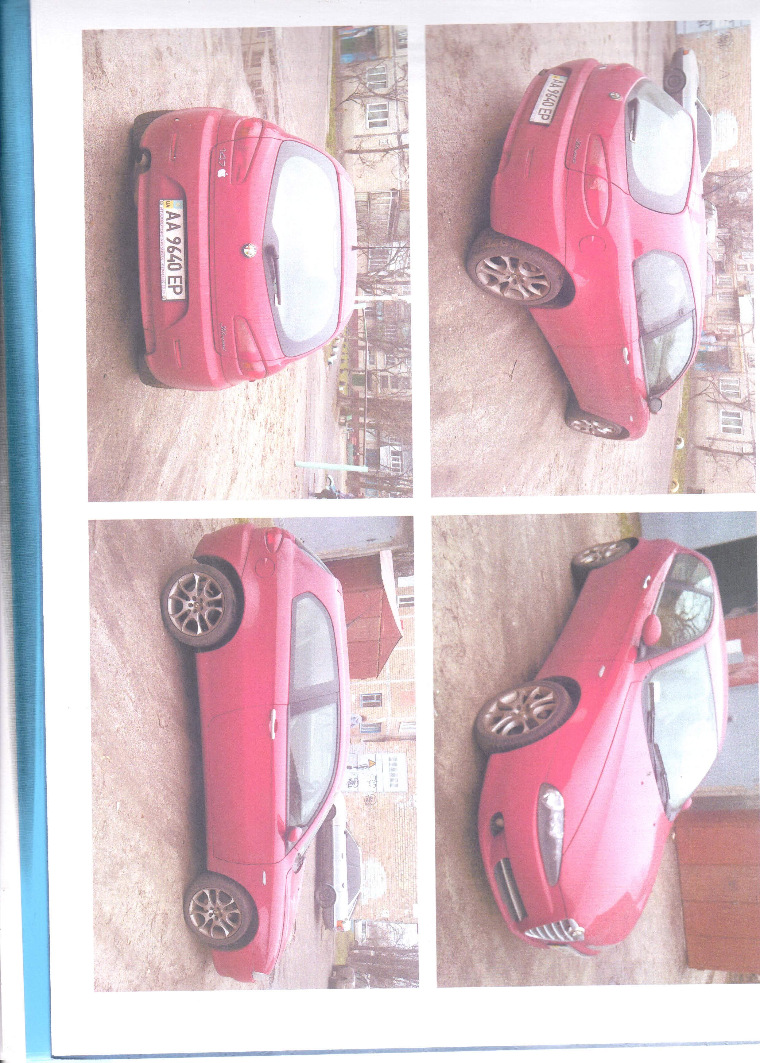 Транспортний засіб марки – ALFAROMEO, модель – 147, об'єм двигуна в куб.см. – 1970, тип кузова - комбі, рік випуску – 2007, вид пального – бензин, колір- червоний. Технічний стан – вм’ятини на даху автомобіля та на капоті. Пошкодження лако-фарбового покриття на передньому бампері.