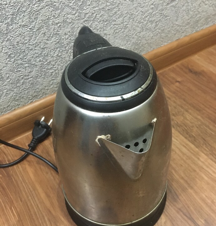 Електрочайник, корпус сріблясто сірого кольору, має по корпусу місцями царапини та потертості.