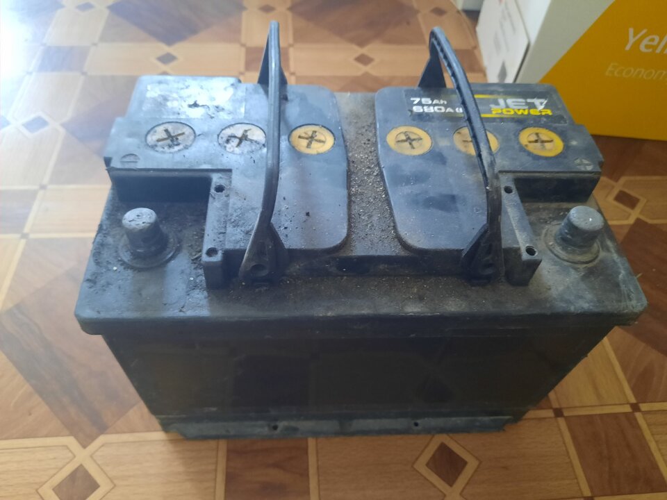 Акумулятор марки «Jet power», 75 A, 12V, чорного кольору, був у використані, має значний ступінь зносу, наявне окиснення клем.,тріщини, сліди витікання щолочної рідини.
