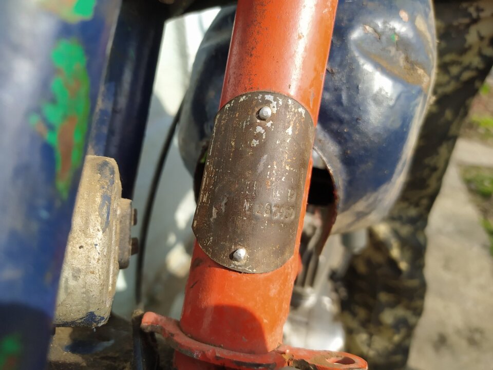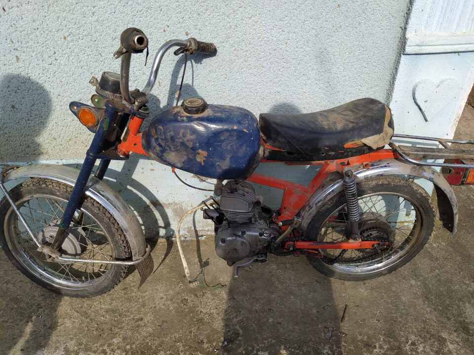 Моторолер "Карпати" помаранчево-синього кольору, частково розукомплектований, наявні сліди корозії (баку та рами), номерний знак відсутній, резина стан зносу понад 50%., ключі та технічний паспорт відсутні.