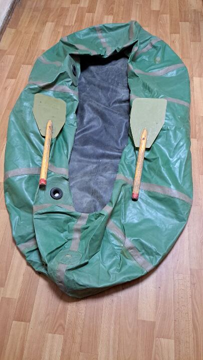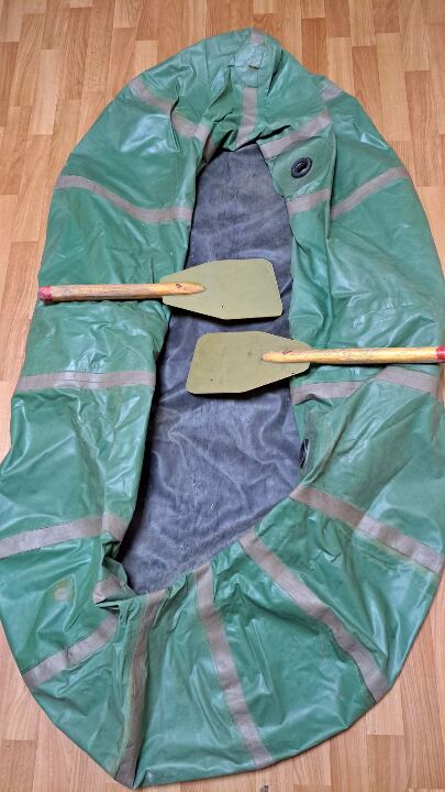 Гумовий човен "Барк" зеленого кольору, бувший у використанні, на човні наявні латки, з 2-ма веслами,в надувному стані не перевірявся – в кількості 1 шт