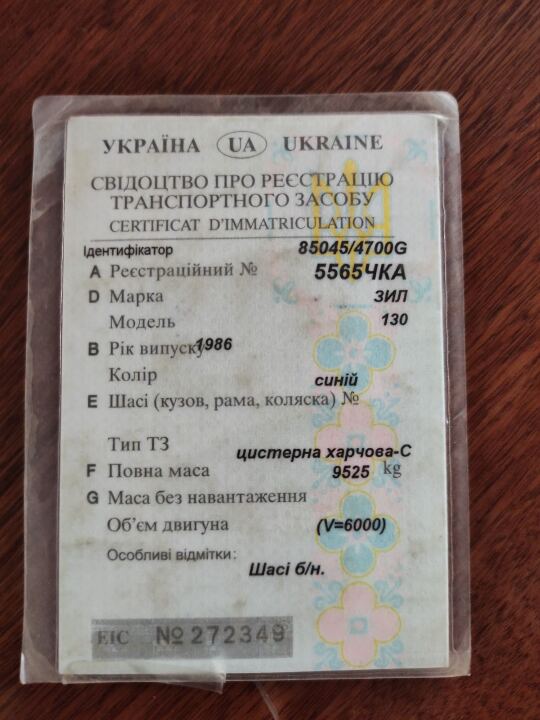 Кузов автомобіля має присутні пошкодження лакофарбового покриття, місця здуття фарби та вм’ятини, корозія та подряпини. Салон частково розукомплектований та має технічні пошкодження, колеса спущені. Двигун відсутній, цистерна з ознаками корозії. Освітлювальні прилади в незадовільному стані. Стан транспортного засобу незадовільний. Наявне Свідоцтво про реєстрацію транспортного засобу. Ключі відсутні.