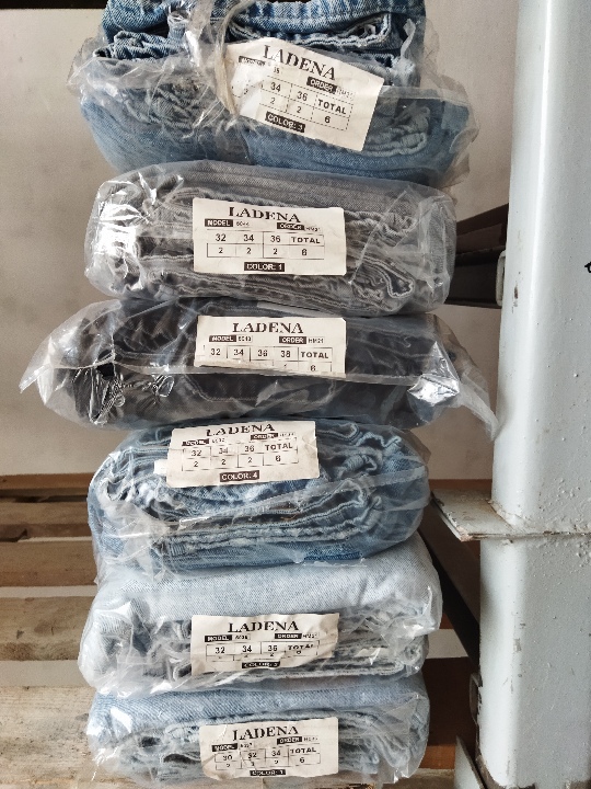 Штани з джинсової тканини, жіночі, іноземного виробництва, марки "Ladena", різних кольорів та розмірів в кількості 36 штуки, без ознак використання, майно зберігається на складі