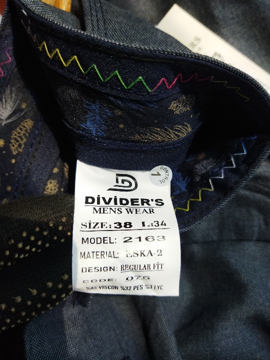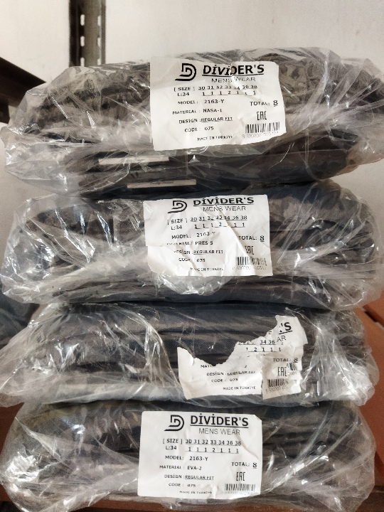 Штани з джинсової тканини, чоловічі, іноземного виробництва, марки "Dividers", різних кольорів та розмірів в кількості 32 штуки, без ознак використання, майно зберігається на складі