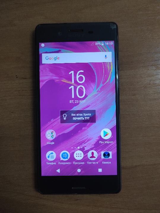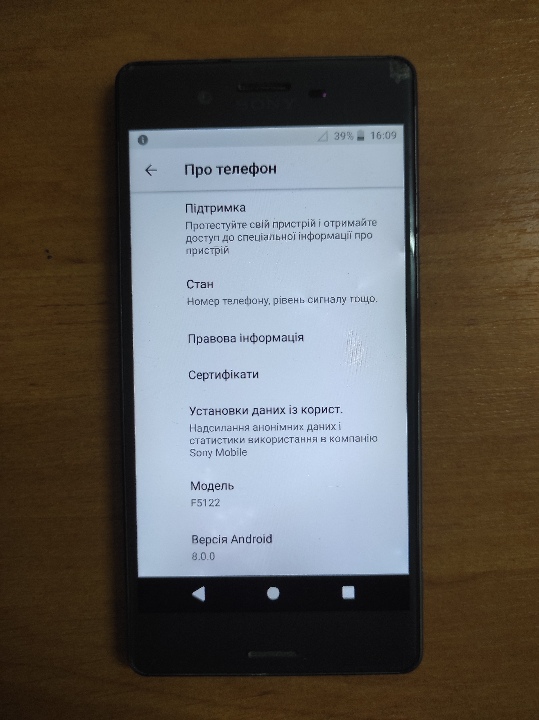 Мобільний телефон марки “SONY”, модель "XPERIA" був у використанні, колір сірий, корпус та екран з потертостями. Телефон в робочому стані, вмикається, сенсор швидкий. Зарядний пристрій відсутній.