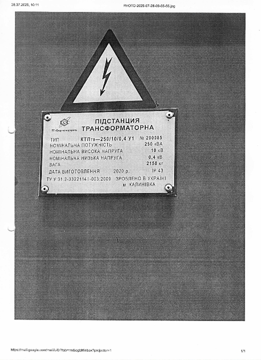 Тип - КТПтв-250/10/0,4 У1 № 20085, номінальна потужність 250кВА, номінальна висока напруга 10кВ, номінальна низька напруга 0,4кВ, вага 2150 кг, дата виготовлення 2020, ІР 43, ТУ У 31.2-33221141-003:2009.