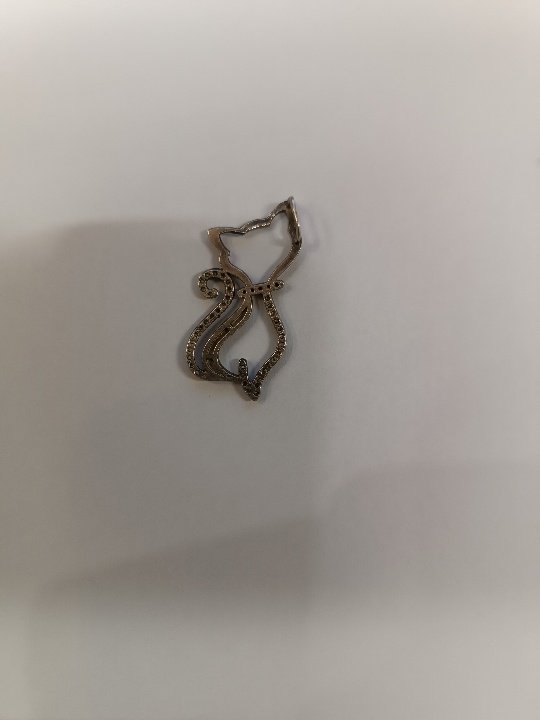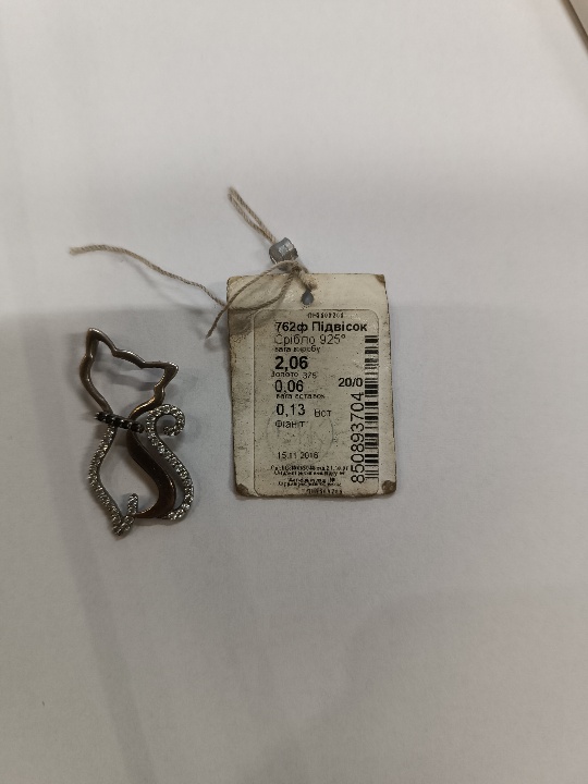 Підвіска у вигляді кішки зі срібла з вставками із фіоніту та золота, загальна маса виробу становить 2,06 грам, з яких 0,06 грам із золота 375 проби, 1,87 грам із срібла 925 проби та 0,13 грам із фіаніту. сліди використання відсутні. Майно конфісковане за рішенням суду № 208/3327/18 від 27.10.2022 виданого Дніпровським районним судом м. Дніпродзержинська Дніпропетровської області