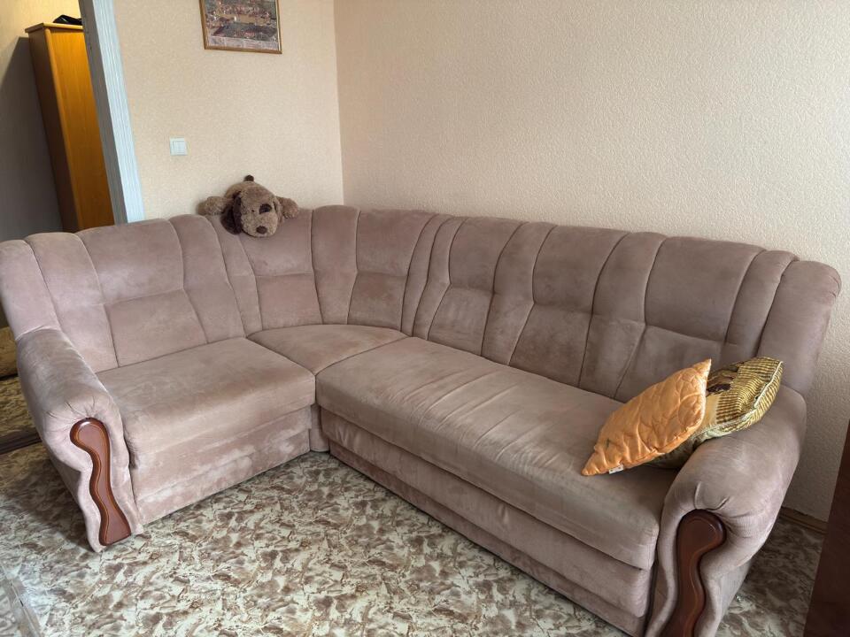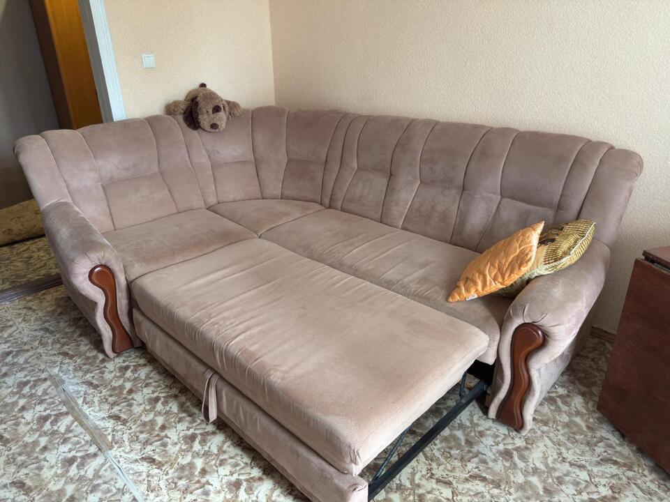 Диван кутовий, б/в, бежевого кольору, в задовільному стані, за зовнішніми ознаками дефектів не має, наявні потертості та невеликі забруднення, має просторе місце для сидіння, має механізм розкладання для сну