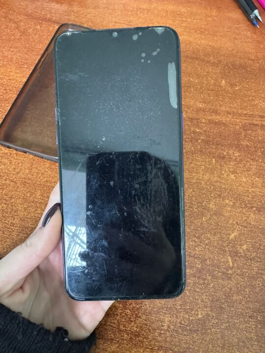 корпус телефону без видимих пошкоджень, екран цілий, без тріщин, на екрані присутнє захисне скло, яке має подряпини та потертості; функціональні кнопки на місці, камера не пошкоджена, зовнішніх ознак розкриття корпусу чи втручання не виявлено.Комплектація: телефон без зарядного пристрою та коробки. Мобільний телефон перебуває у цілісному стані, слідів пошкодження або розукомплектування не виявлено. На предмет роботи не перевірявся.