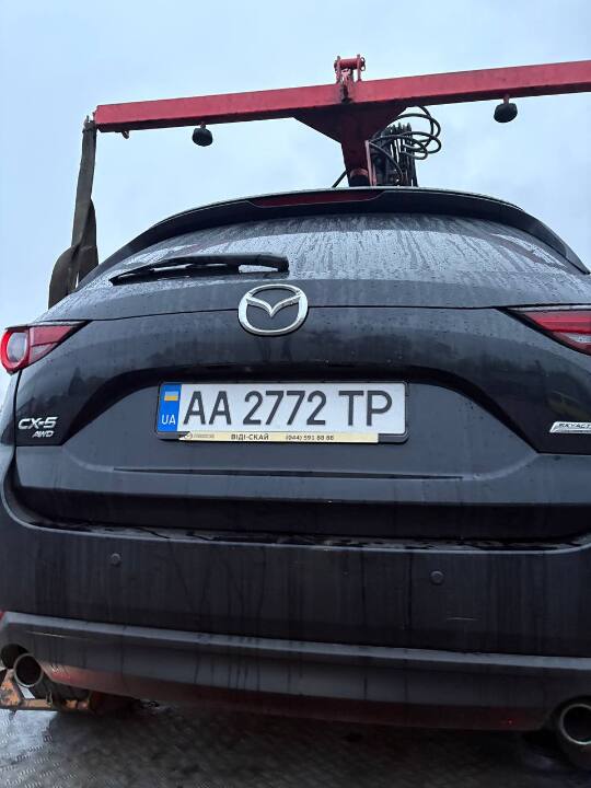 Транспортний засіб - автомобіль марка: MAZDA, модель CX-5, шасі (кузов, рама) JM3KFBCL0H0217723, 2017 року випуску, тип – ЗАГАЛЬНИЙ ЛЕГКОВИЙ УНІВЕРСАЛ, колір – ЧОРНИЙ, державний номер АЕ8188КВ, об’єм двигуна: 2488 куб. см., вид пального: бензин, коробка передач: автоматична, пробіг: невідомий, свідоцтво про реєстрацію т/з: відсутнє, ключі: відсутні, технічний стан: сколи та подряпини ЛФП по периметру авто, потертості ЛФП передній бампер, задній бампер, диски литі R17 - 4 шт., гума R17 235/65, виробник Kapsen - 4 шт., знос більше 20%. На т/з встановлений номерний знак АА2772ТР незаконний, якого не існує