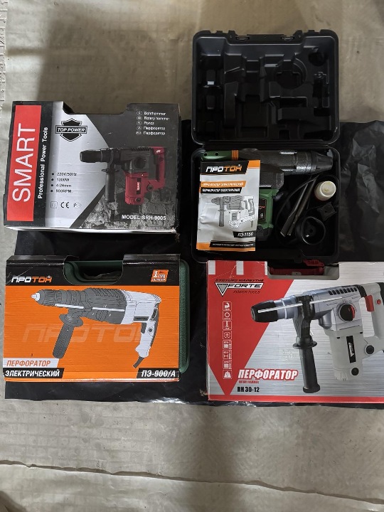 - Перфоратор електричний торгівельної марки Протон ПЗ-1150, 220В, 50Гц, потужність 1150Вт, Сила удару 4,8 мм, 870 об/хв, діаметр свердління в бетоні 4-26 мм, с/н 0416 169759 0109, відсутня вилка кабелю електроживлення, зламаний перемикач режимів.