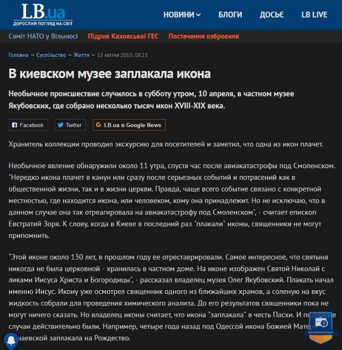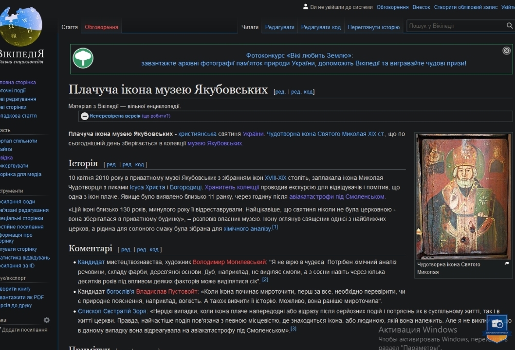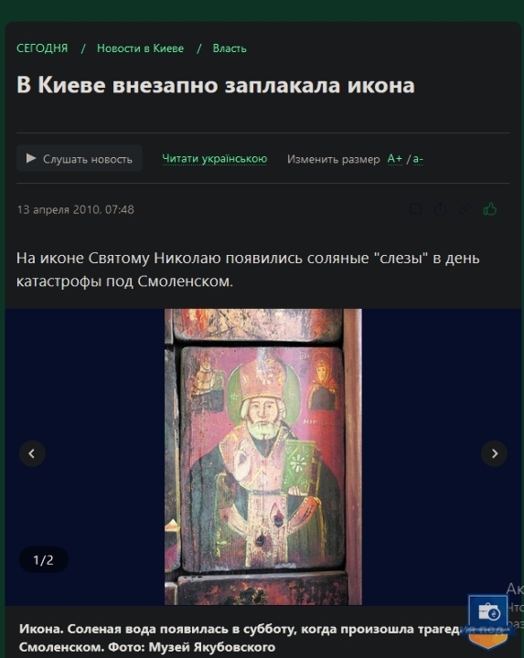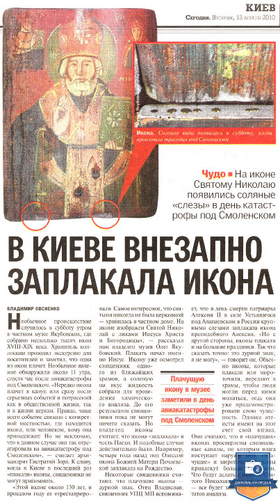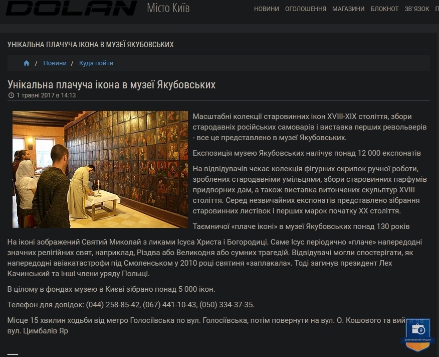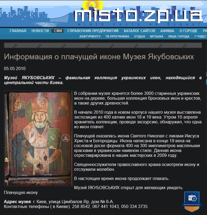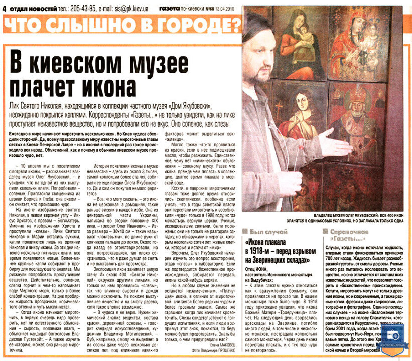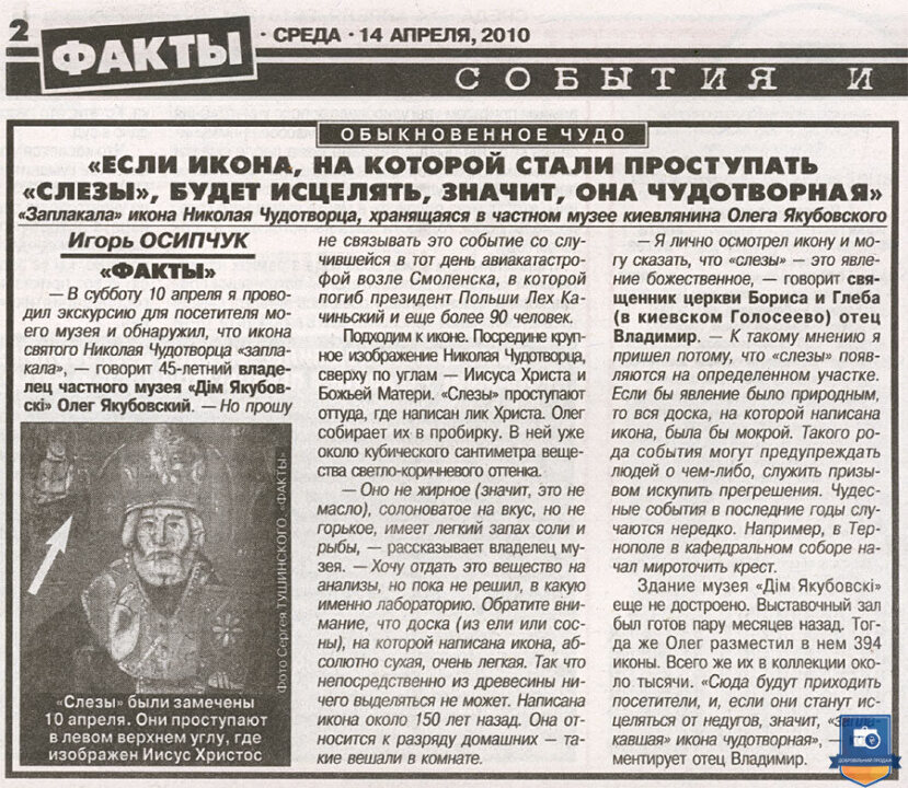 Ікона з образом Святого Чудотворця Миколая та ликами Ісуса Христа та Божої Матері – православна святиня України та усього християнського світу, унікальний, магічний, незбагненний, навіть чистим світлим розумом, релікт ХІХ століття, що прославився дивом сльозоточіння в 2010 році. За пів року до того вона була виставлена в іконостасі Дому Якубовських, серед 384 подібних образів, і заплакала 10 квітня, напередодні Пасхи. Явище було виявлено близько 11 ранку, через годину після авіакатастрофи (терористичного акту з боку росії) польського президентського літака у Смоленську. На думку духовенства – ікони плачуть, передбачаючи та пророкуючи катаклізми та соціальні потрясіння. На нашу думку – це був Божий знак-попередження щодо буремних політичних подій в Україні, які незабаром відбулися на Майдані та переросли у війну росії проти України. Уважається, що образи Святого Ніколая (Миколая) ніколи не плачуть, так і у нашому випадку солона рідина текла двома струмками саме з очей Ісуса. Це диво відбувалося протягом 5 років щовесни. Сотні вірян, журналістів та священиків відвідали Музей Якубовських, помолились іконі та наочно переконалися у дивному явищі. Не менш як 5 каналів телебачення показали це у своїх програмах новин, про це написали не менш як 3 багатотиражні газети, інформація про цю Ікону є у мережі інтернет.