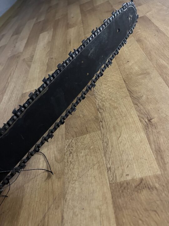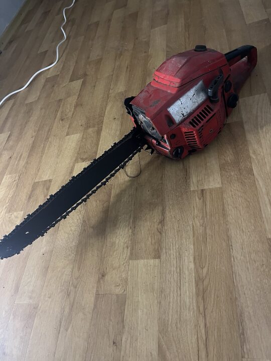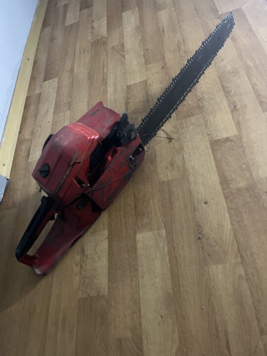бензопила марки «EUROTEC» корпус помаранчевого кольору з шиною довжиною 45 см, була у використанні, робочий стан не перевірявся. Майно конфісковане за рішенням Дніпровського районного суду, виконавчий лист № 173/174/22 від 13.08.2025