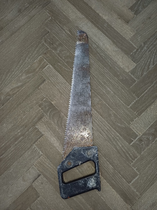 Ручна пила з пластиковою ручкою чорного кольору, покрита корозією, майно конфісковане згідно вироку Турківського районного суду Львівської області № 458/1150/25 1-кп/458/146/2025 від 11.12.2025 року.