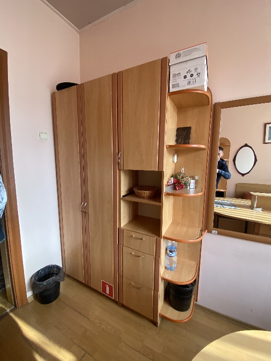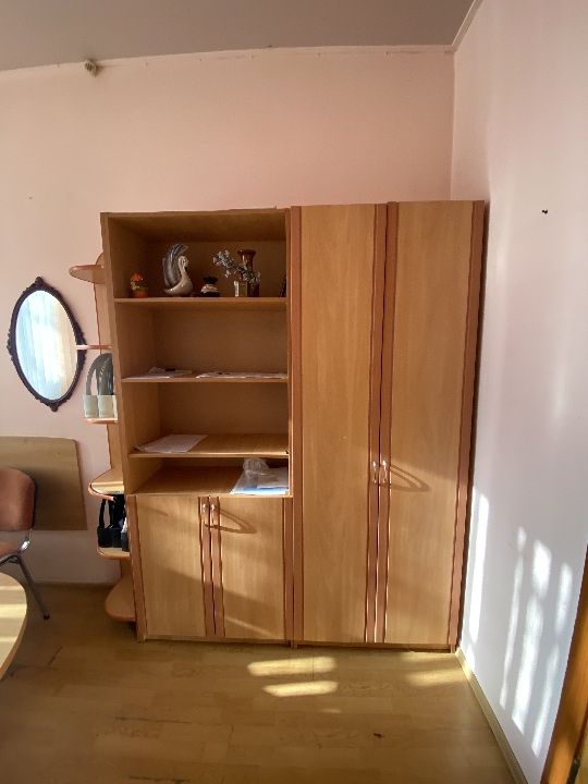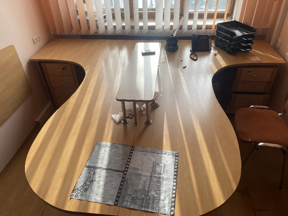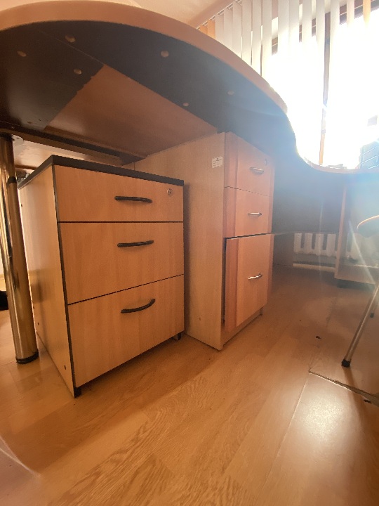Комплект офісних меблів б/в: стіл офісний з тумбами 2 од., шафа на дві секції, шафа на дві секції з полицями, світлого кольору