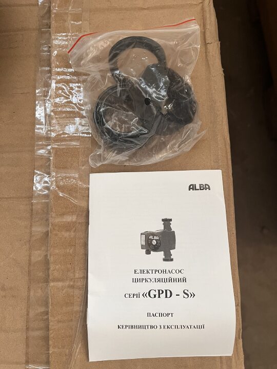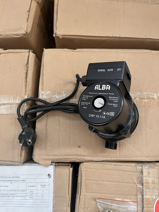 Водяні насоси для підвищення тиску торгової марки «ALBA», назва «CRP 15-11А в кількості 398 штук, водяні насоси циркуляційні 25/6-130 (cable 1,0m +nuts) «GPD-25-6S-130», торгова марка «ALBA» в кількості 15 штук, стан новий