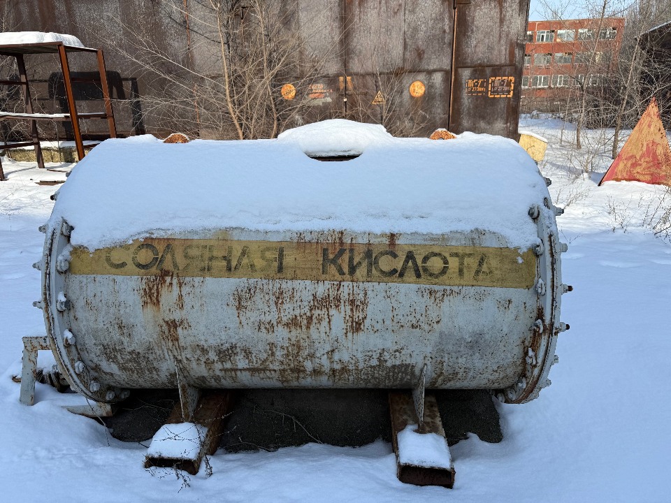 Резервуар для зберігання соляної кислоти, інв. №11254 (9), металевий, сірого кольору з написом “Соляна кислота".