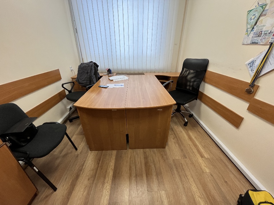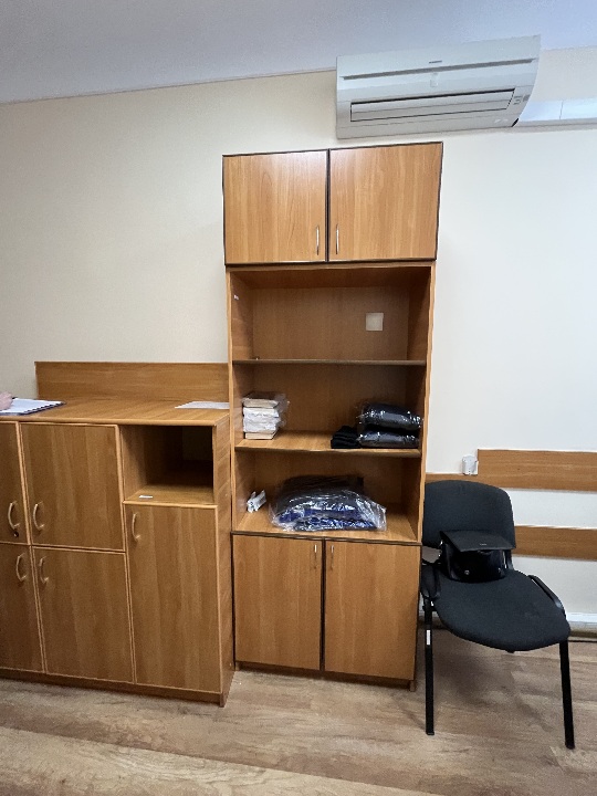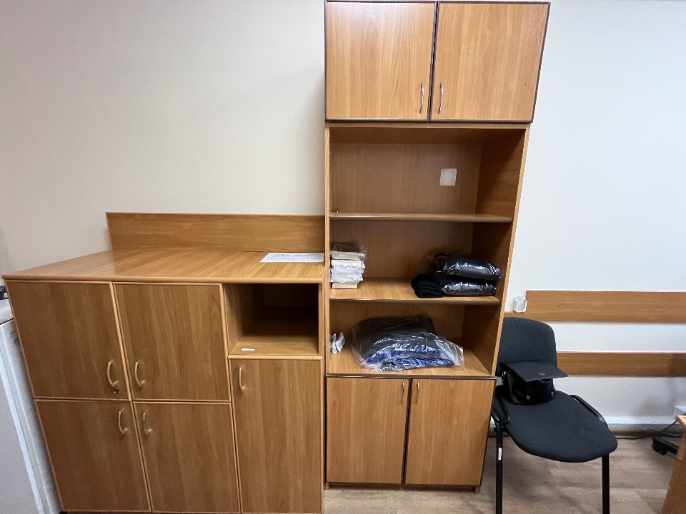 Комплект меблів для офісу б/в: стіл письмовий 2 од, тумби приставні з шухлядами 2 од, шафа з полицями 2 од, шафа для одягу 1 од, комод