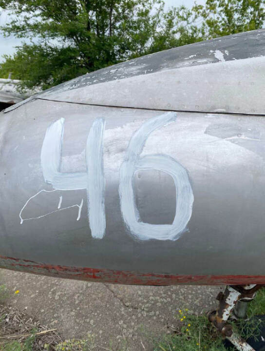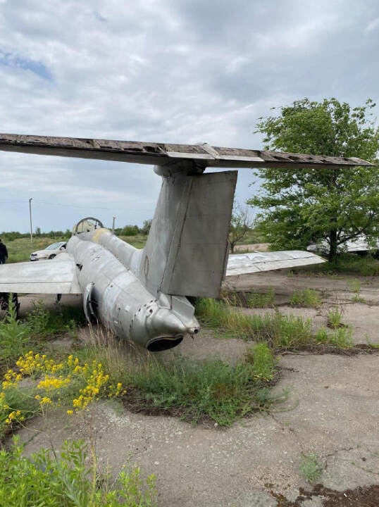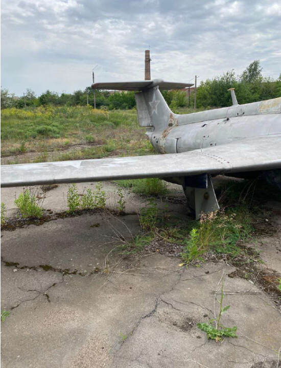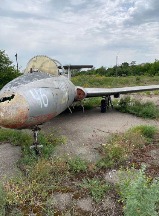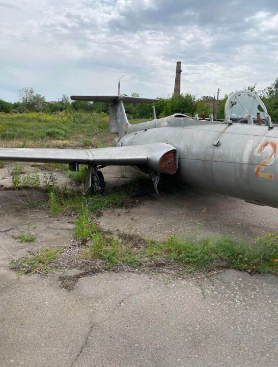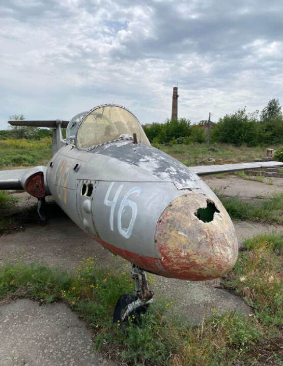 Літак Л-29, інвентарний № 46, заводський № 993523. Марка та модель: Л-29 — радянський навчальний реактивний літак, розроблений в середині 1950-х років і призначений для підготовки пілотів. Рік випуску: не встановлено Об'єм двигуна: без двигуна Вид пального: авіаційне паливо Пробіг / наліт: невідомо (дані відсутні) Комплектація: має базову комплектацію для тренувальних польотів. Включає тренажерну кабіну з двома місцями, прилади для управління і навігації. Потреба в ремонті: потребує значного ремонту, зокрема заміни реактивного двигуна, перевірки авіоніки, структурних елементів і загального огляду для визначення стану решти систем. Колір: світло-сірий Пошкодження носової частини: значні пошкодження в області носової частини літака, зокрема в зоні переднього обтікача. Корозія та зношування металевих частин. Пошкодження поверхні крила: в області крил спостерігається пошкодження зовнішньої поверхні: кілька ділянок виглядають подертими, а також є сліди зношування фарби.