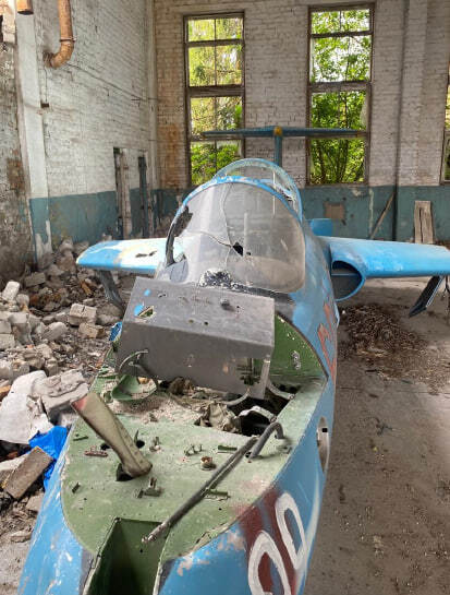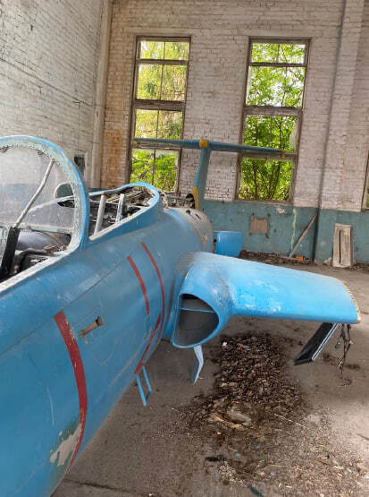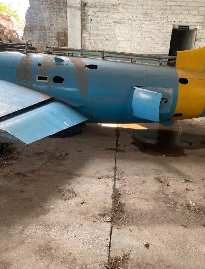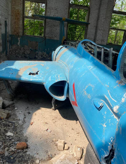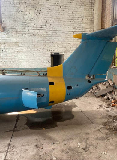 Літак Л-29, інвентарний № 99, заводський № 395166. Марка та модель: Л-29 — радянський навчальний реактивний літак, розроблений в середині 1950-х років і призначений для підготовки пілотів. Рік випуску: не встановлено Об'єм двигуна: без двигуна Вид пального: авіаційне паливо Пробіг / наліт: невідомо (дані відсутні) Комплектація: має базову комплектацію для тренувальних польотів. Включає тренажерну кабіну з двома місцями, прилади для управління і навігації. Потреба в ремонті: потребує значного ремонту, зокрема заміни реактивного двигуна, а також перевірки всіх основних систем. Фюзеляж має механічні пошкодження в передній частині, видні сліди корозії та зношування на поверхні. Пошкодження включають відсутність або пошкодження частин конструкції, що також потребують відновлення.Колір: пофарбований у синьо-блакитний колір з жовтими акцентами
