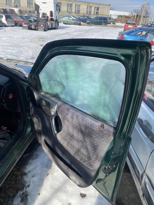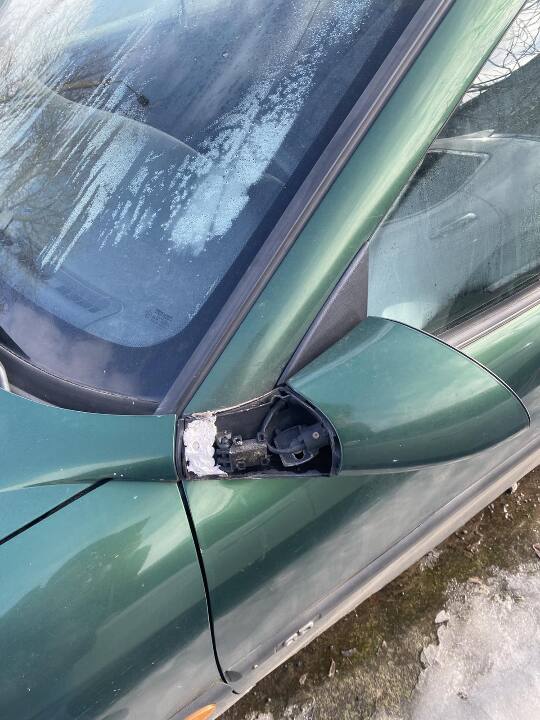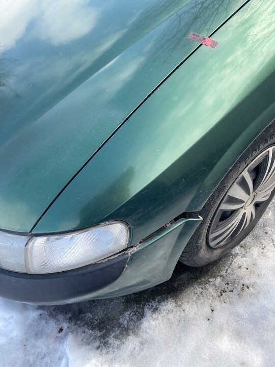 Пошкоджений передній бампер, ліве дзеркало заднього огляду. Вмятина на передньому правому крилі.