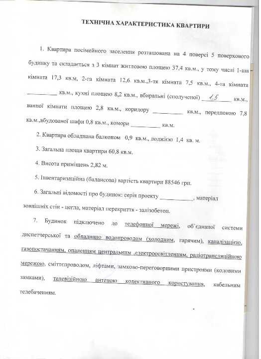 Трикімнатна квартира №58, загальною площею 60,80 кв.м., житлова площа, 37,4 кв.м., за адресою Сумська обл., м. Конотоп, вул. Клубна, 111, розташована на 4-му поверсі, складається з: 1. кімната площею - 17,3 кв.м., 2. кімната площею - 12,6 кв.м., 3. кімната площею - 7,5 кв.м., кухня - 8,2 кв.м., вбиральня - 1,5 кв.м., ванна - 2,8 кв.м., передпокой - 7,8 кв.м., вбудова шафа - 0,8 кв.м., балкон - 0,9 кв.м., лоджія - 1,4 кв.м. В будинку підведено газ, воду, та електрика, каналізація центральна, телефонні мережі, висота потолків 2,82 м., вікна деревяні та металопластикові, під'їзні дороги асфальтовані, вся інфраструктура розвинута та доступна(супермаркет, дитячий садок, зупинка громадського транспорту - все в межах 500 метрів). Належить боржнику на праві власності на підставі - свідоцтва про право на спадщину, серія та номер: 777, виданого 21.06.2024, видавник: приватний нотаріус Конотопського районного нотаріального округу Сумської області Пастушенко Л. В., номер записту про право власності №55558362. Зареєстровані особи - відсутні.