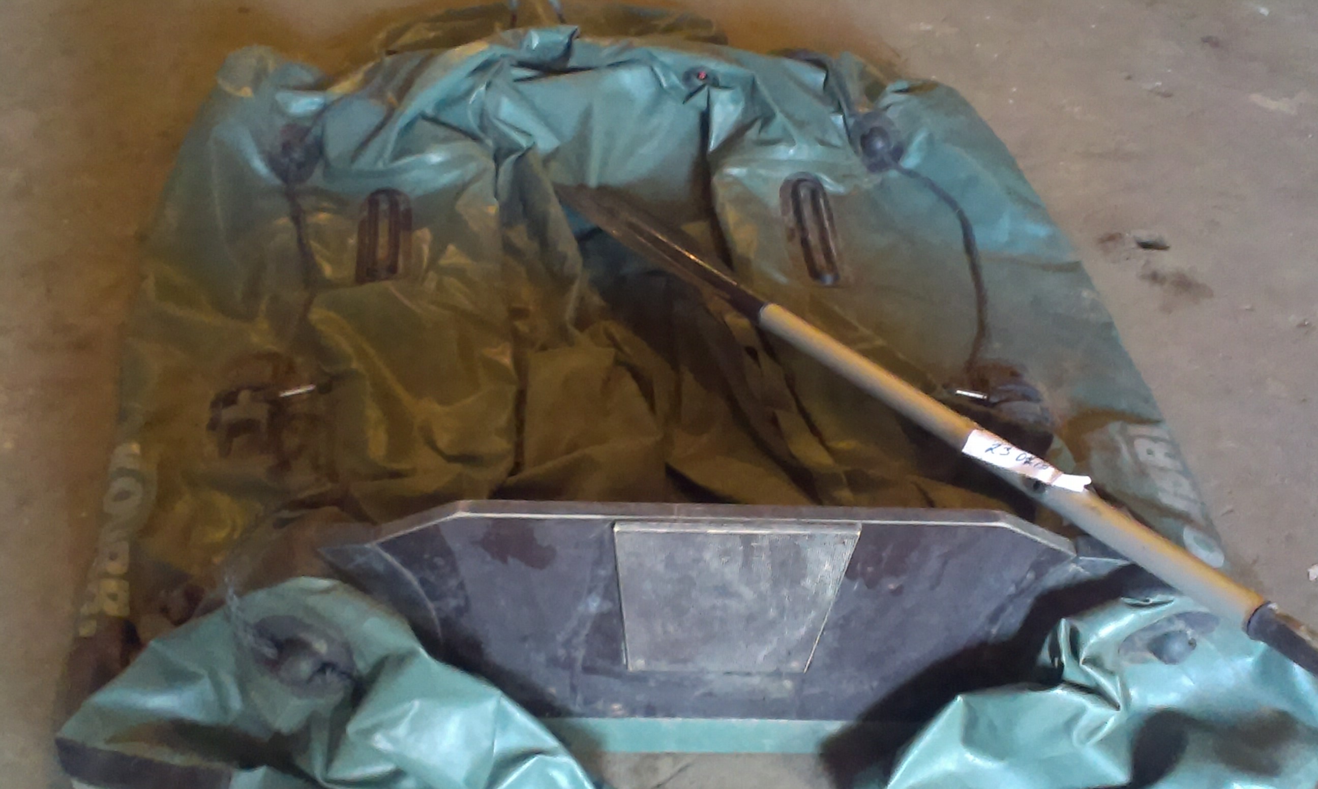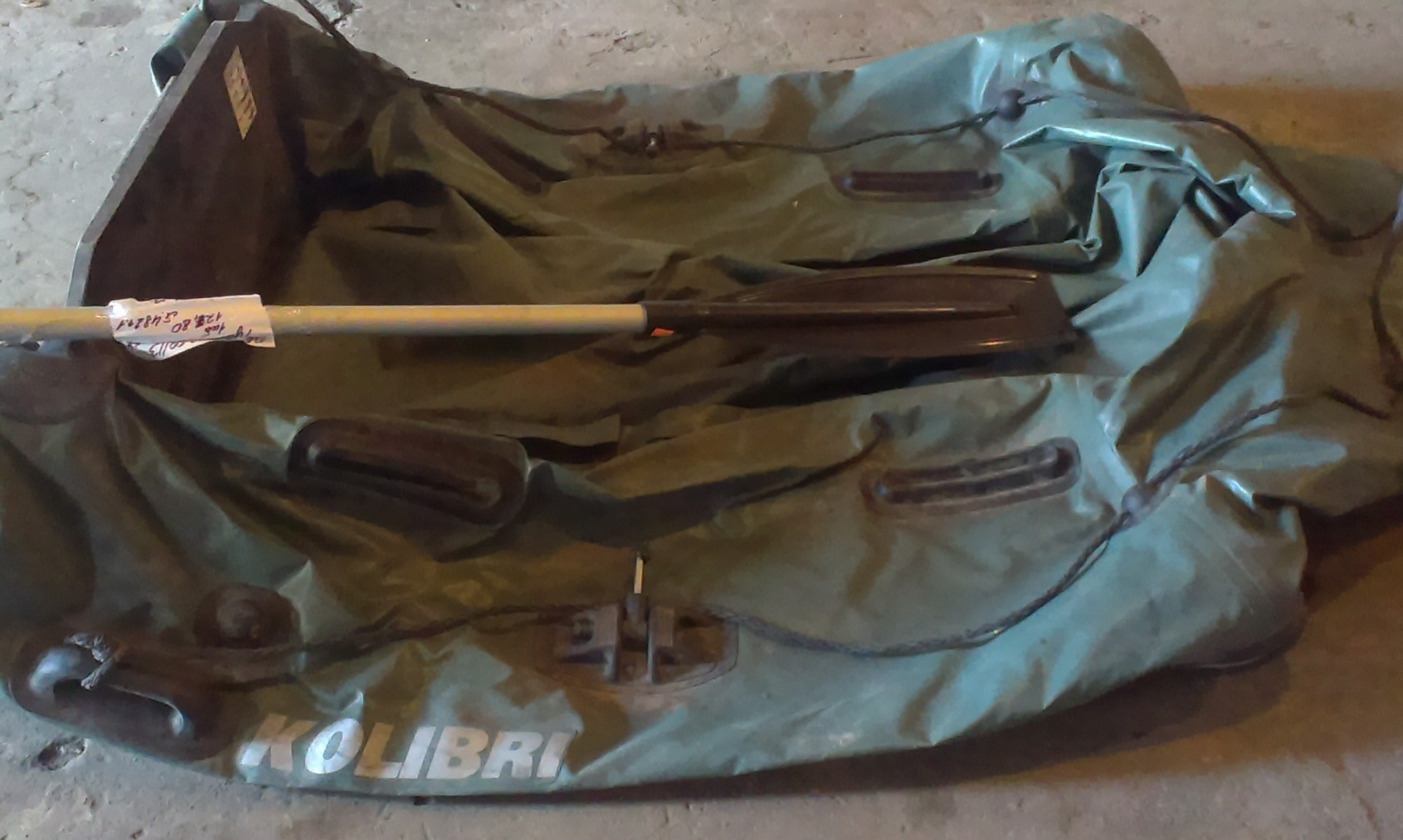 Гумовий човен "KOLIBRI" з одним металевим веслом, бувший у користуванні, колір - зелений. Брудний, потертий, зломаний повітряний клапан, відсутні сидіння.